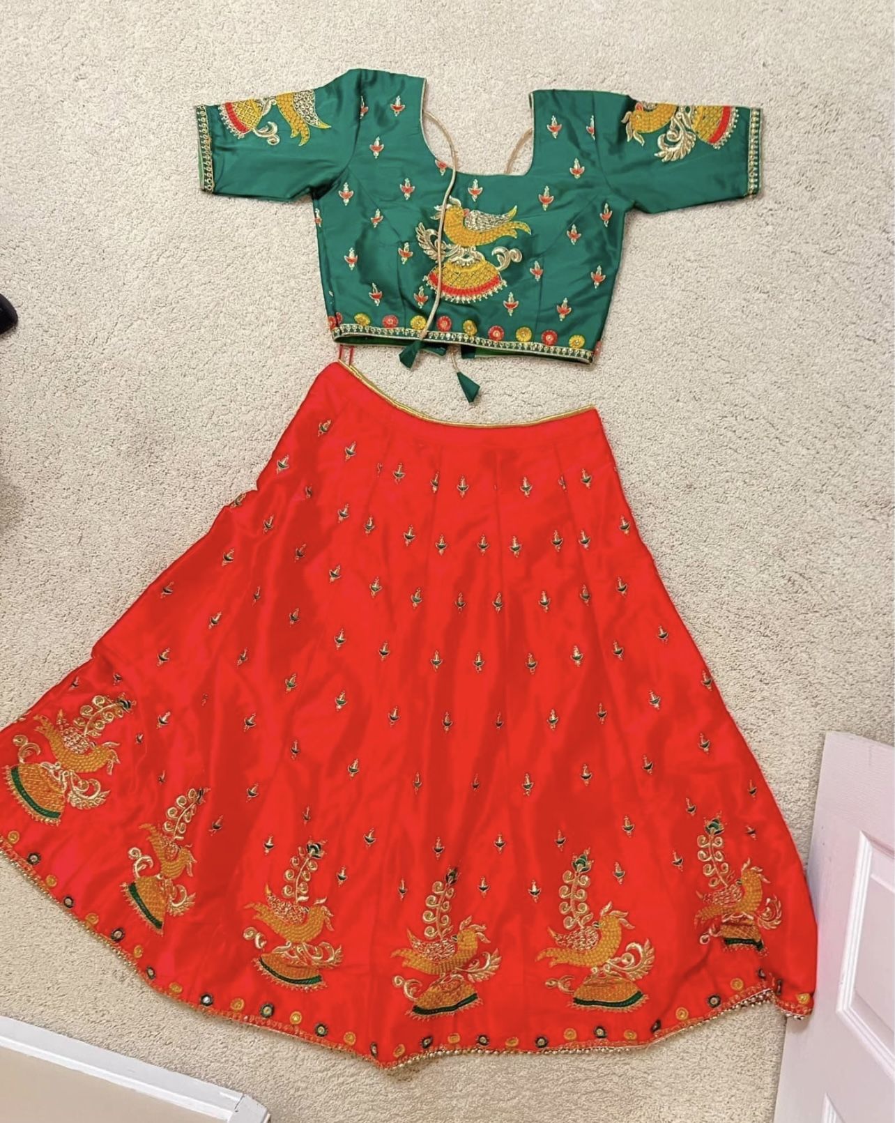 Get ready for the festive season with this beautiful, vibrant lehenga set. Ideal for Diwali celebrations, this outfit combines traditional style with intricate embroidery. Set Includes: A green embroidered crop top with a stunning red skirt. Design Details: The set features detailed embroidery with peacock and floral motifs in gold, green, and red threads, creating an elegant look. Condition: New