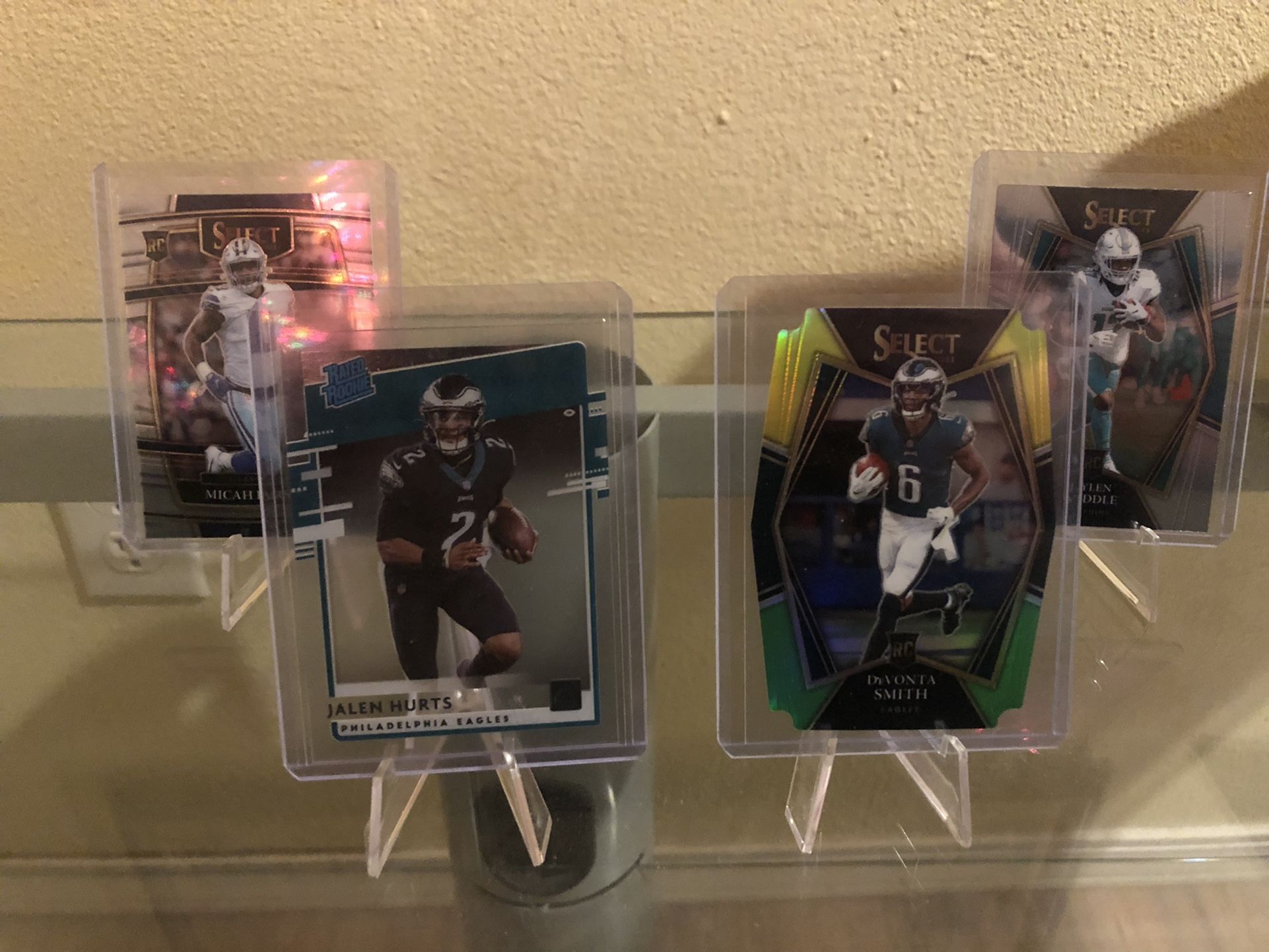 Jalen hurts rated rookie donruss Devonta smith rookie neon die cut select Micah parsons rookie base select Jaylen waddle rookie select Dallas cowboys, Philadelphia eagles, Miami dolphins