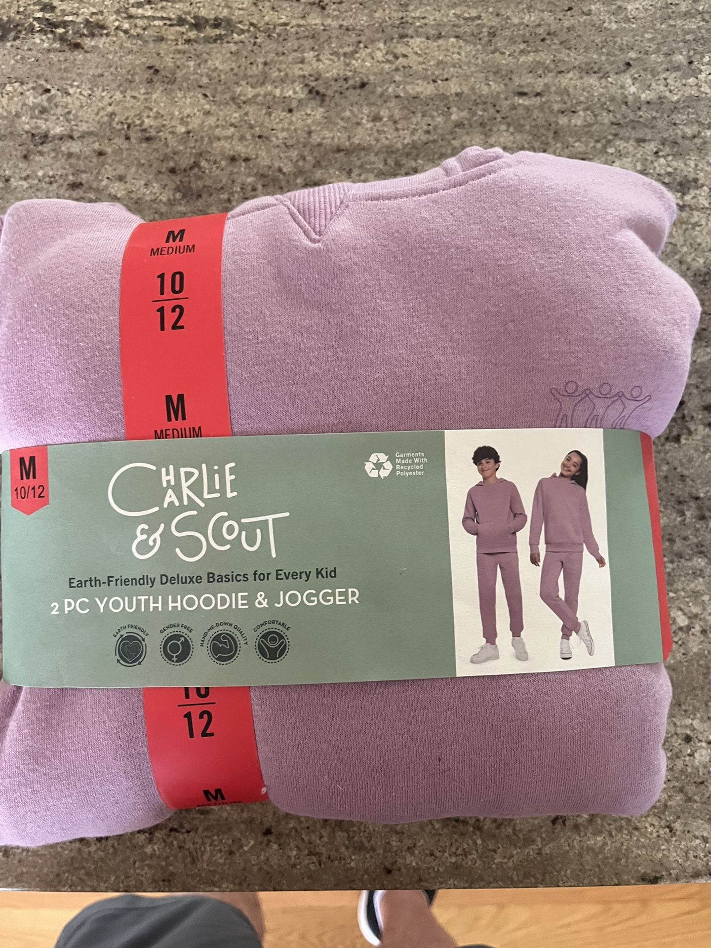 Brand new with tags Paid 30 Girls 10/12 Medium Porch pick up Downers Grove This is a Charlie & Scout youth hoodie and jogger set in size 10-12 for unisex kids. The hoodie is in a light purple color with a pullover style, long sleeves, and made of polyester fleece. The set includes a hoodie and joggers, featuring a classic fit.