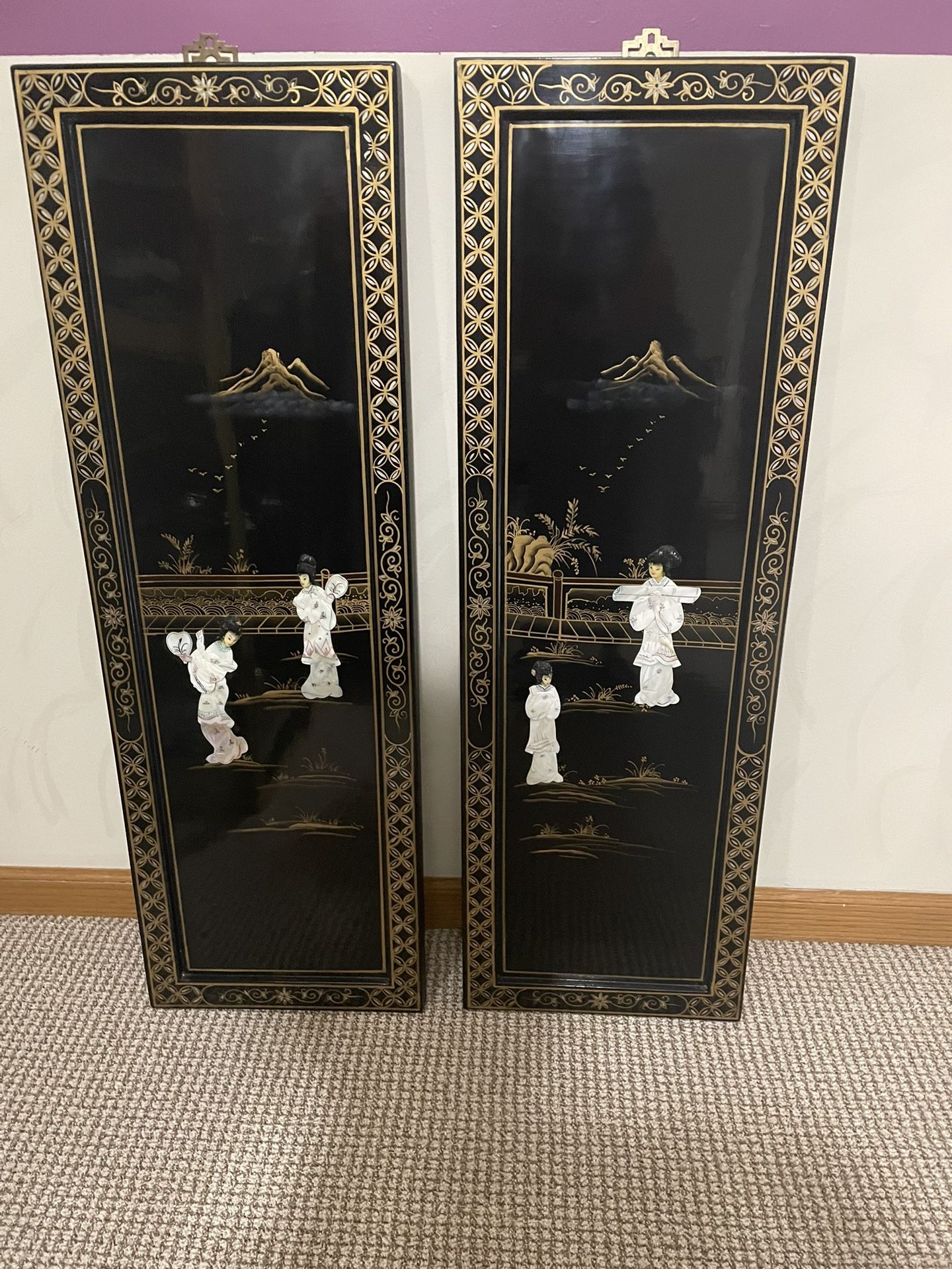 .If you are interested, offer a reasonable price and they are yours please and thank you MUST SELL. Beautiful Oriental vintage wall panels in excellent condition, …painted in black lacquer and decorated in 3D mother of pearl pieces to represent Asian scenery. The inside of the panel is matte black and the outer frame is black lacquer trimmed with a gold hand painted design. Kept in a non-smoking house. Sold as a set of two only Sorry even though our daughter is downsizing, she decided to keep two 12 inches wide 36 inches tall and 7/8 inches deep . The weight is approximately 4 lbs. Pick up in Palos Hills, 111th and Southwest Highway on