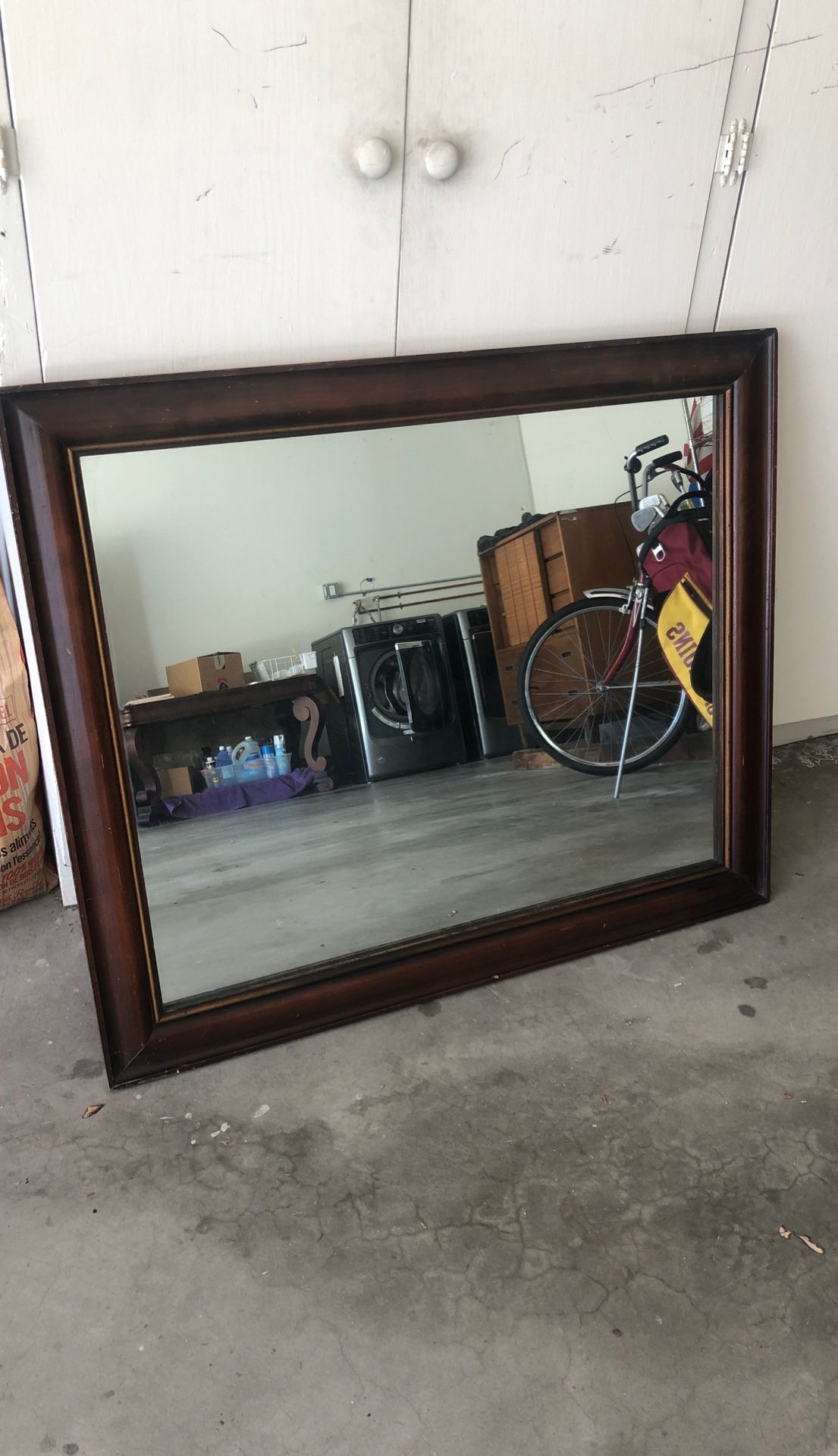 Gorgeous wood mirror. They don’t make em like this anymore! Measures 37” x 31”