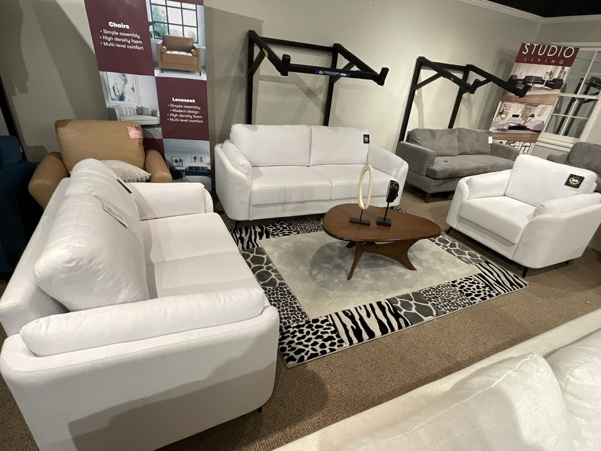 Selling new floor sample at discounted price as shown. White color fabric upholstered 3 piece set which includes sofa - loveseat and chair. Dimensions are tagged in pictures .