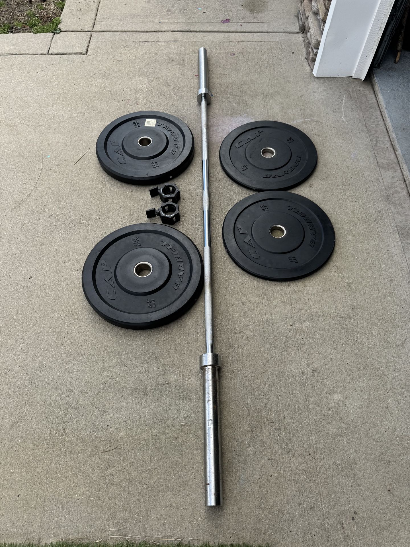 45 lb Barbell, 2x25lb rubber plates, 2x10lb rubber plates, and 2 collar clamps Barbell is a little rusty, but not bent, and weight plates are in great condition