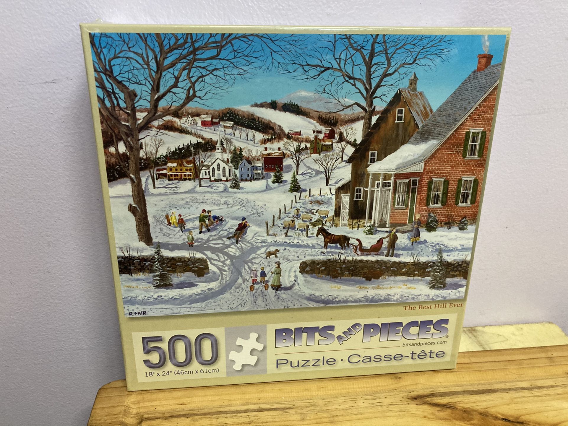 Bits and Pieces 500 piece puzzle of “The Best Hill Ever!” Winter snow scene of the countryside, playing, sledding, buildings. Beautiful. New, factory sealed.