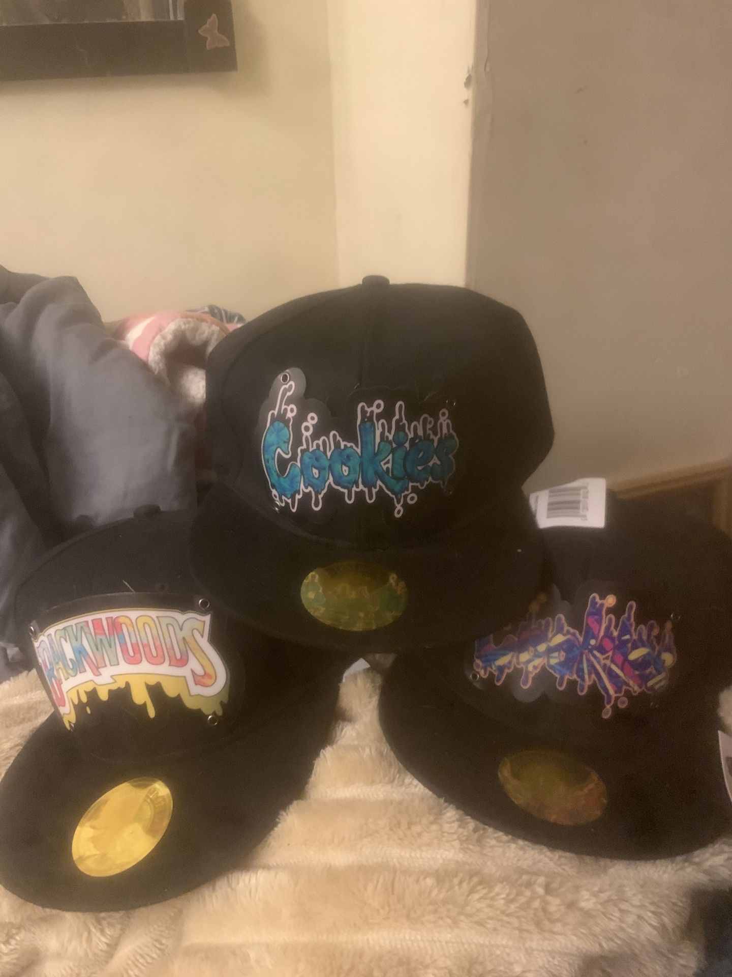 Three custom design hats. Never been worn before. Ten dollars each or twenty for all three!