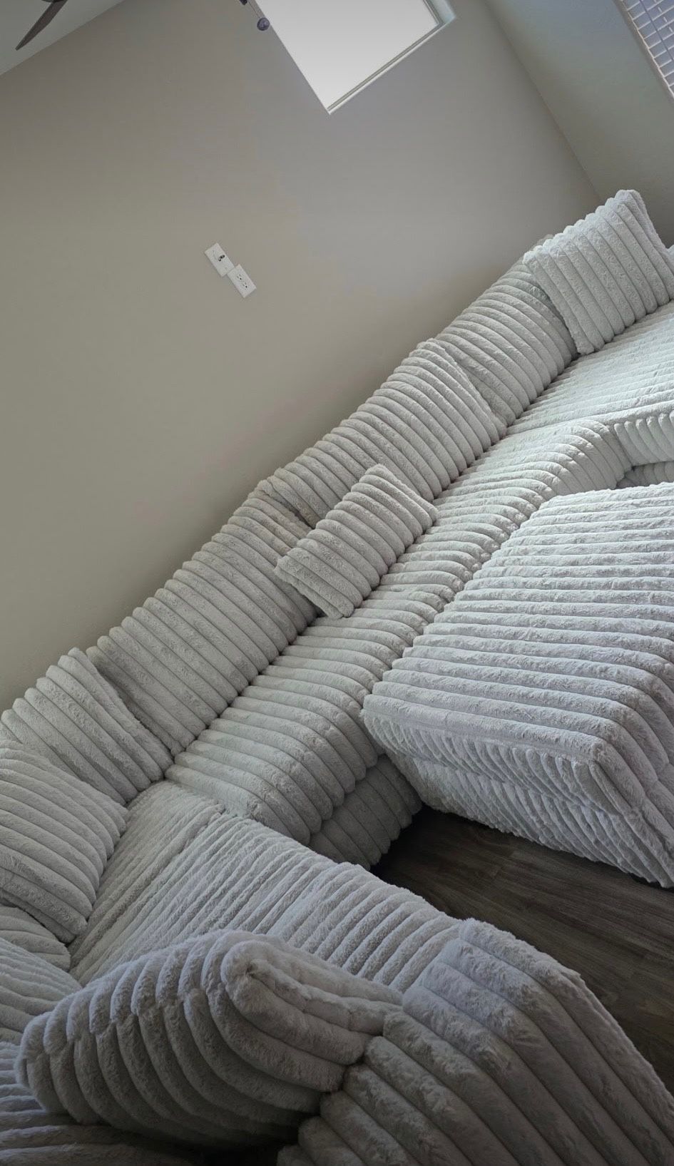 Less than 6 months old and was hardly ever sat on due to color and not wanting to get it dirty. Selling because we had to downsize. Paid $5000 asking $3000