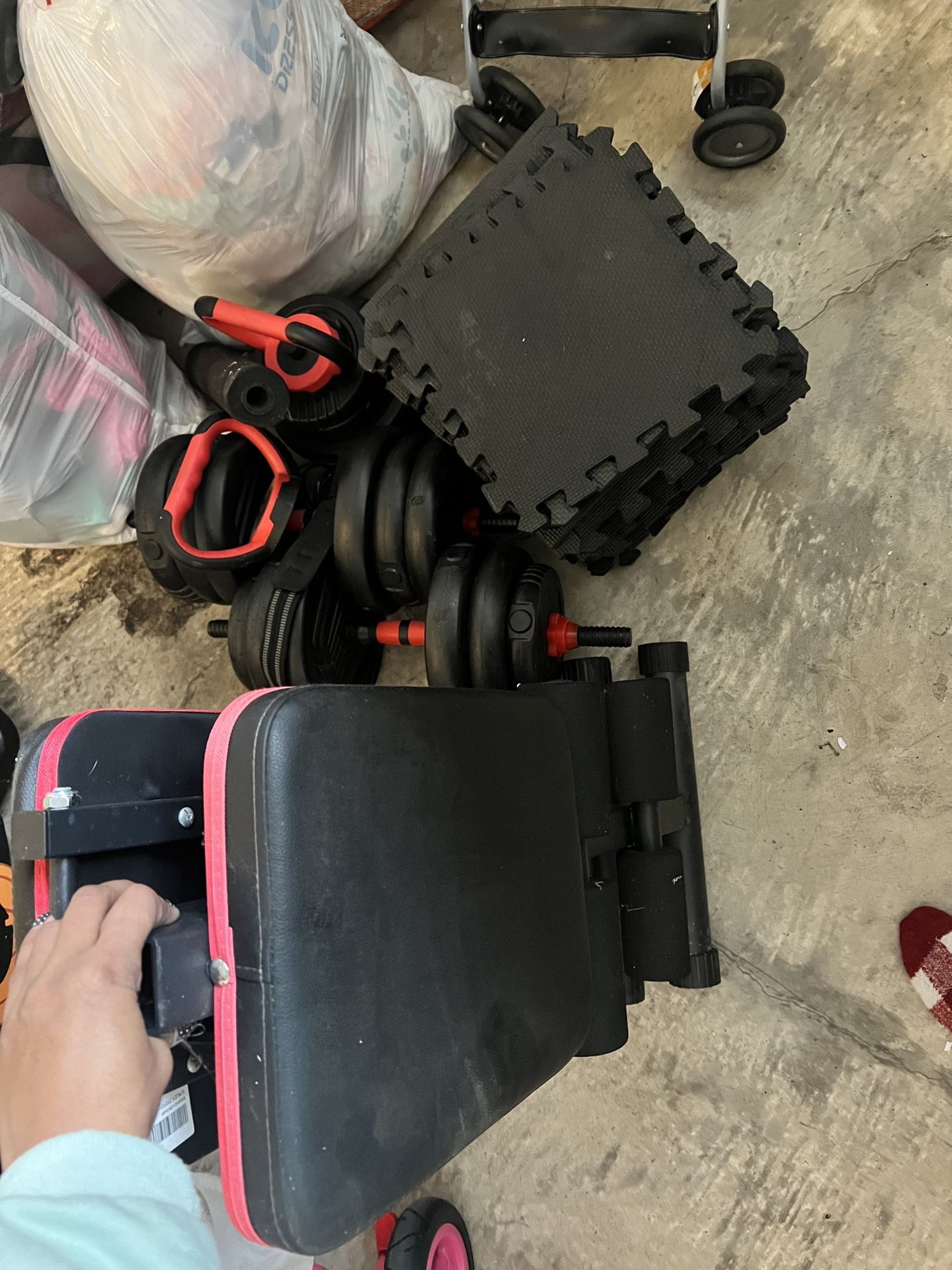 90lbs in weights with attachments for barbell, kettle bell, & free weights Jump rope Gym Mats Foldable bench I’ll also throw in a Pilates board I’m moving and need to get rid of them.