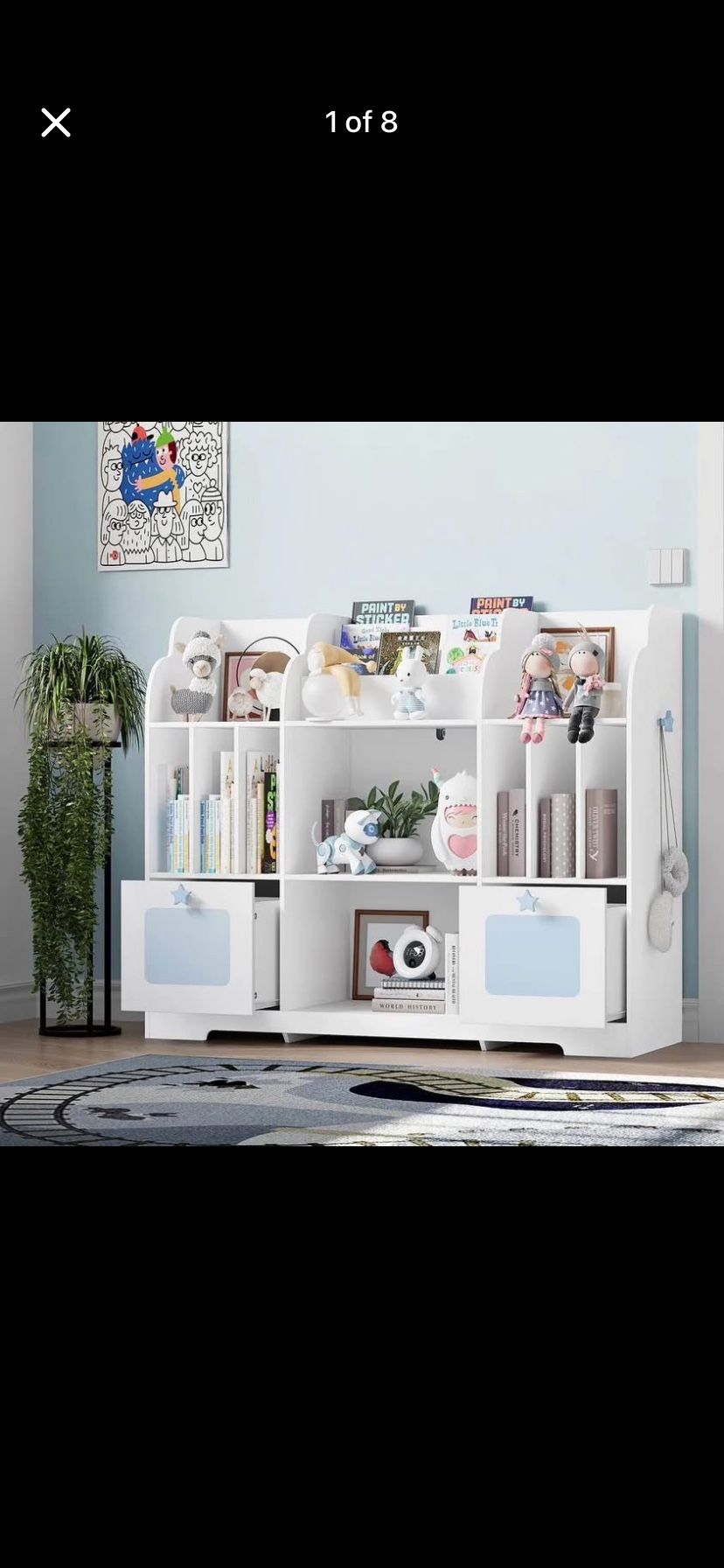 Toy Storage Organizer, 46'' Toy Shelf, Bookshelf with White and Blue Bookcase & 2 Storage Cubbies