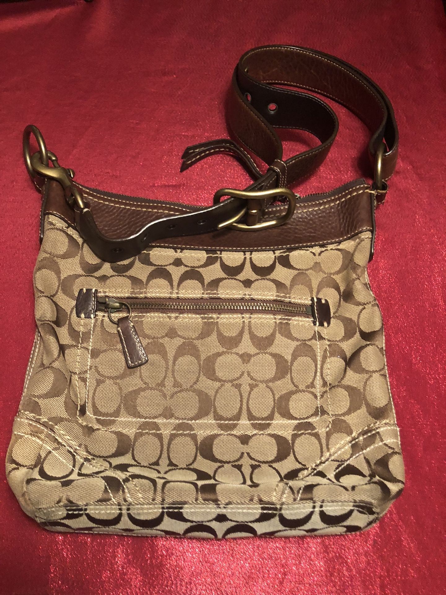 COACH Signature βCβ Brown Canvas handbag π gold tone hardware π brown leather accents and trim π single leather handle 7β drop top zipper closure with brown leather pull π fully lined π side zipper pocket. Minimal Wear. Make this yours today! Meet up near Millenia