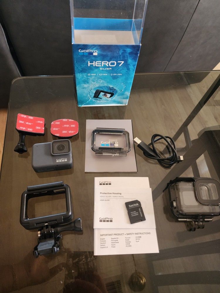 Brand new, Sold as shown. NO SCRATCHES on go pro screen and camera lens, still in its original box. PICKUP ONLY Accepting offers Color: Silver 256GB of Storage | 4k recording | Waterproof Comes with everything in the picture, even waterproof case and mount sticky pads and SD card and Adapter. Great for underwater recording and/or streaming!