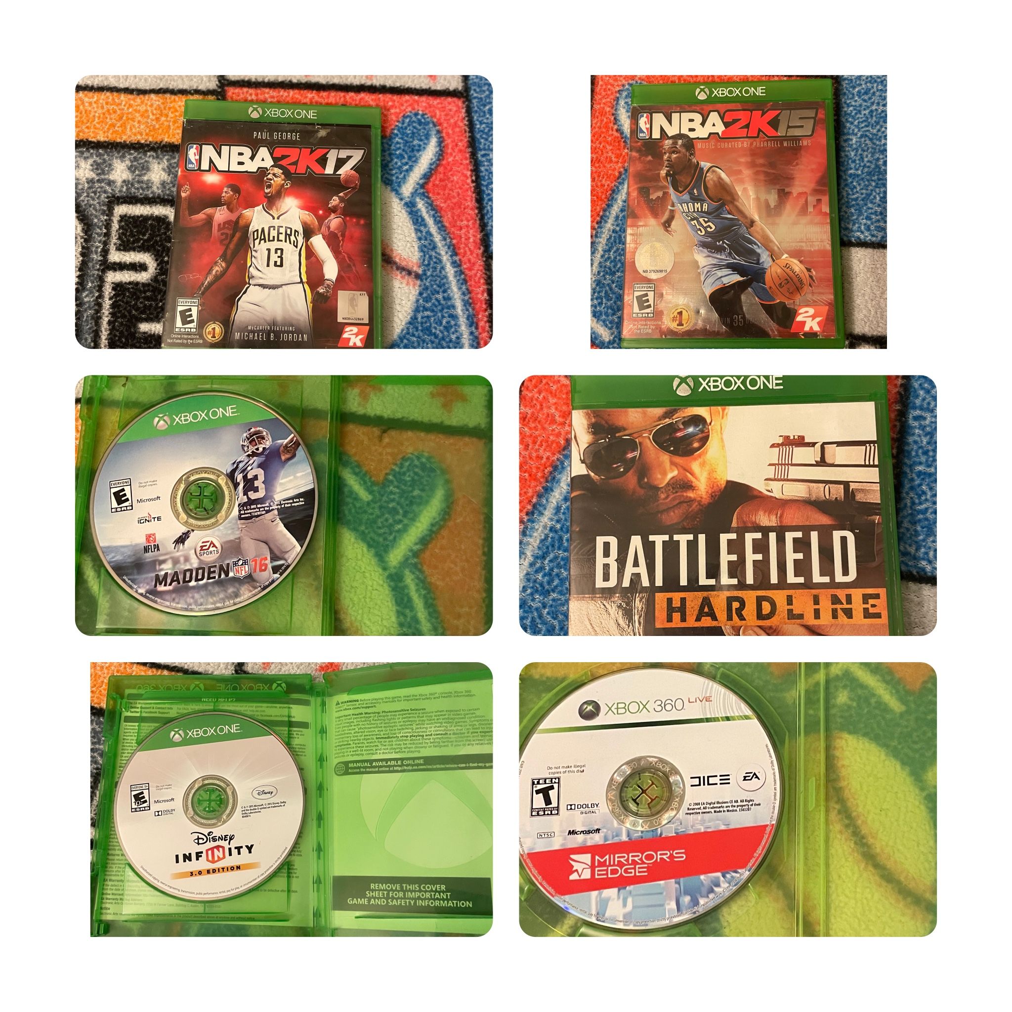 6 Xbox One Games For Sale! $5 Each The Games Are: NBA2K15 NBA2K17 BATTLEFIELD HARDLINE MADDEN 16 DISNEY INFINITY 3.0(SOLD) MIRRORS EDGE