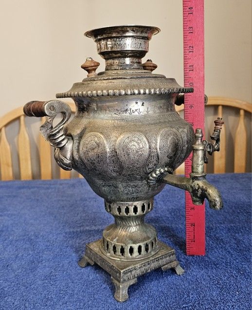 Samovar: a metal container traditionally used to heat up and boil water. Although originating in Russia, the samovar is well known outside of Russia and has spread through Russian culture to other parts of Eastern Europe. Traditionally this was heated with coal or kindling to boil water. Samovars are prized for their rarity and beautiful workmanship. This one is in very good condition and appears complete. Item sold as historical artifact, not for food use. Pick up in Easley! Cash preferred, will also accept Cash-App, Zelle or Venmo. Sorry, no holds unless a payment or deposit has been made prior to picking up. Shipping may be possible at buyers expense. Est $20-$30