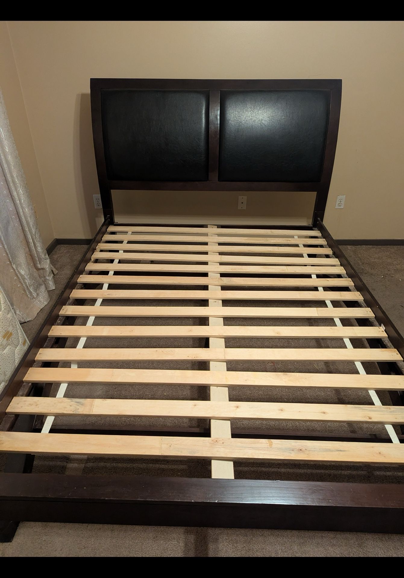 Queen bed with dark wood and black leather headboard. Mattress in great condition . Bed has been disassembled for easy transport. All parts included