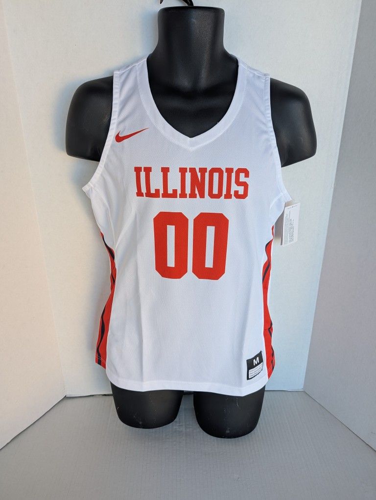 Serious Buyers Only/ New with Tags*** Women's Basketball Primarily white with red accents. The text and numbers are red. There are red panels or stripes running down the sides of the jersey. The number on both the front and the back is 00 (a double-zero). This is a piece of athletic apparel, most likely a women's or unisex cut (given the style and the way it's presented), intended to be worn for sport or as fan gear for the Illinois Fighting Illini team.