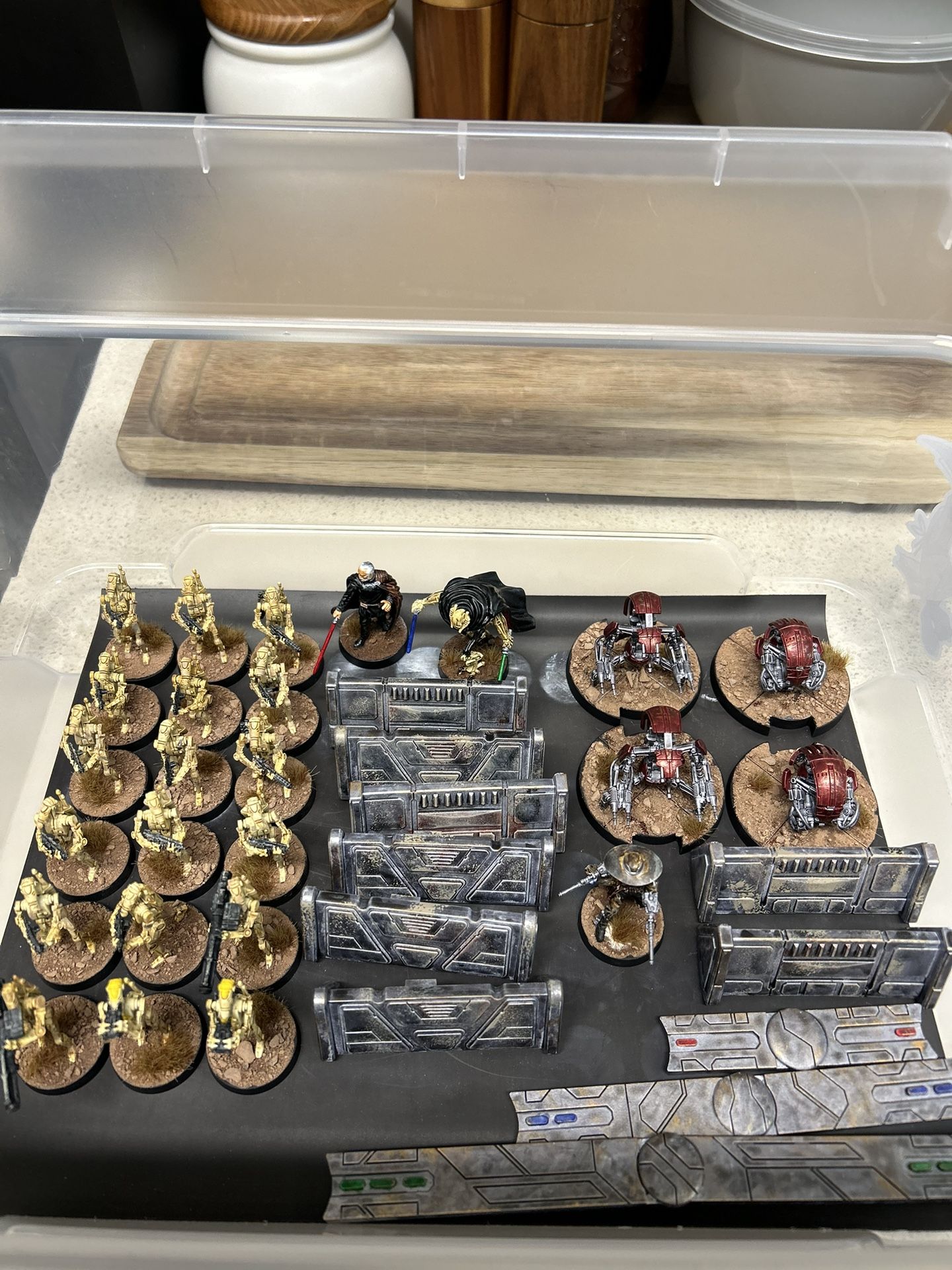 Star Wars miniatures built and painted. Comes with command cards, barricades, measuring tools, dice and lots more pieces to play the game. All miniatures are based with magnets. Have a caring box with magnetic bottom also included. Including extras like glue, paints, and brushes as well.
