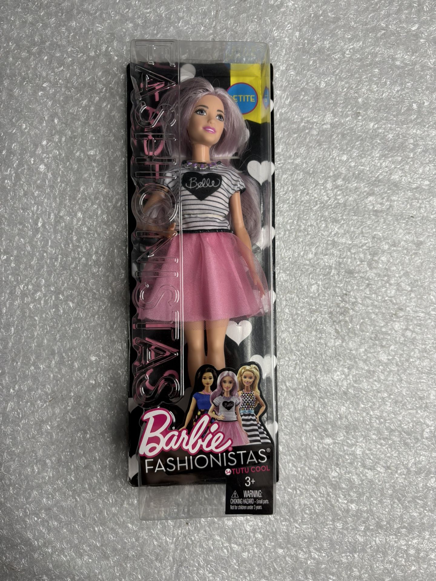 Unused/new in package Barbie Fashionistas Doll #54 Tutu Cool. It is part of the Barbie Fashionistas line, which features dolls with diverse body types, skin tones, eye colors, and hairstyles. This specific doll is a "Petite" body type. She is dressed in a striped top with "Belle" written on it and a pink tutu skirt. The packaging indicates it is suitable for ages 3 and up. It was released in 2016 by Mattel.