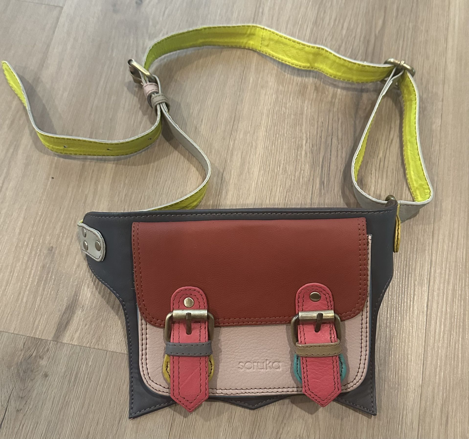 Brand new, never used. 7” wide x 5 1/2” tall. Handmade with recycled leather. Colors are brown, blue, pink, yellow and green. Double buckle with magnetic studs in front for easy access. Zipper pocket on backside. This bag comes with an adjustable shoulder/cross-body strap. Retail price is $79.99.