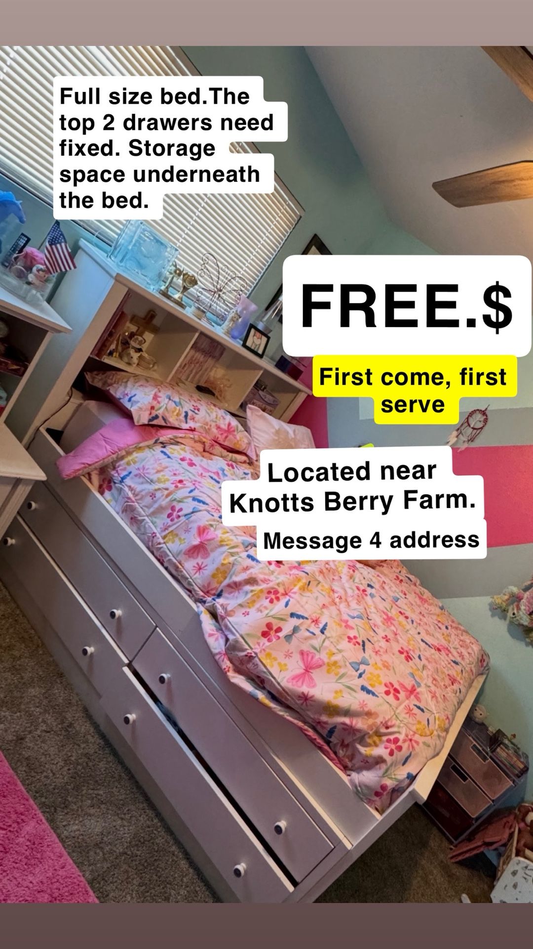Free. Top two drawers need fixed. First come first serve. No delivery.