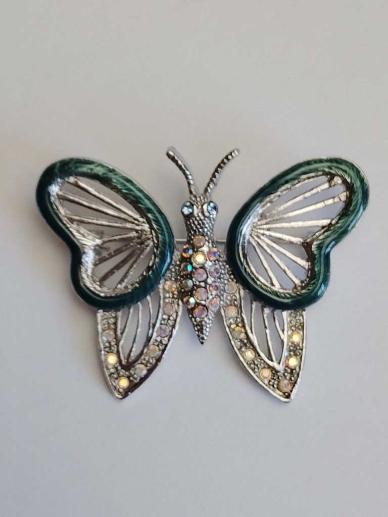 A lovely silver tone butterfly brooch with multicolor rhinestones and outlined enamel peacock blue wings. Perfect accent for a denim jacket or blazer. Excellent pre-owned condition. Please view all photos listed which include measurements. Thanks for looking and be sure to check out my other listings for more accessories and other great items!