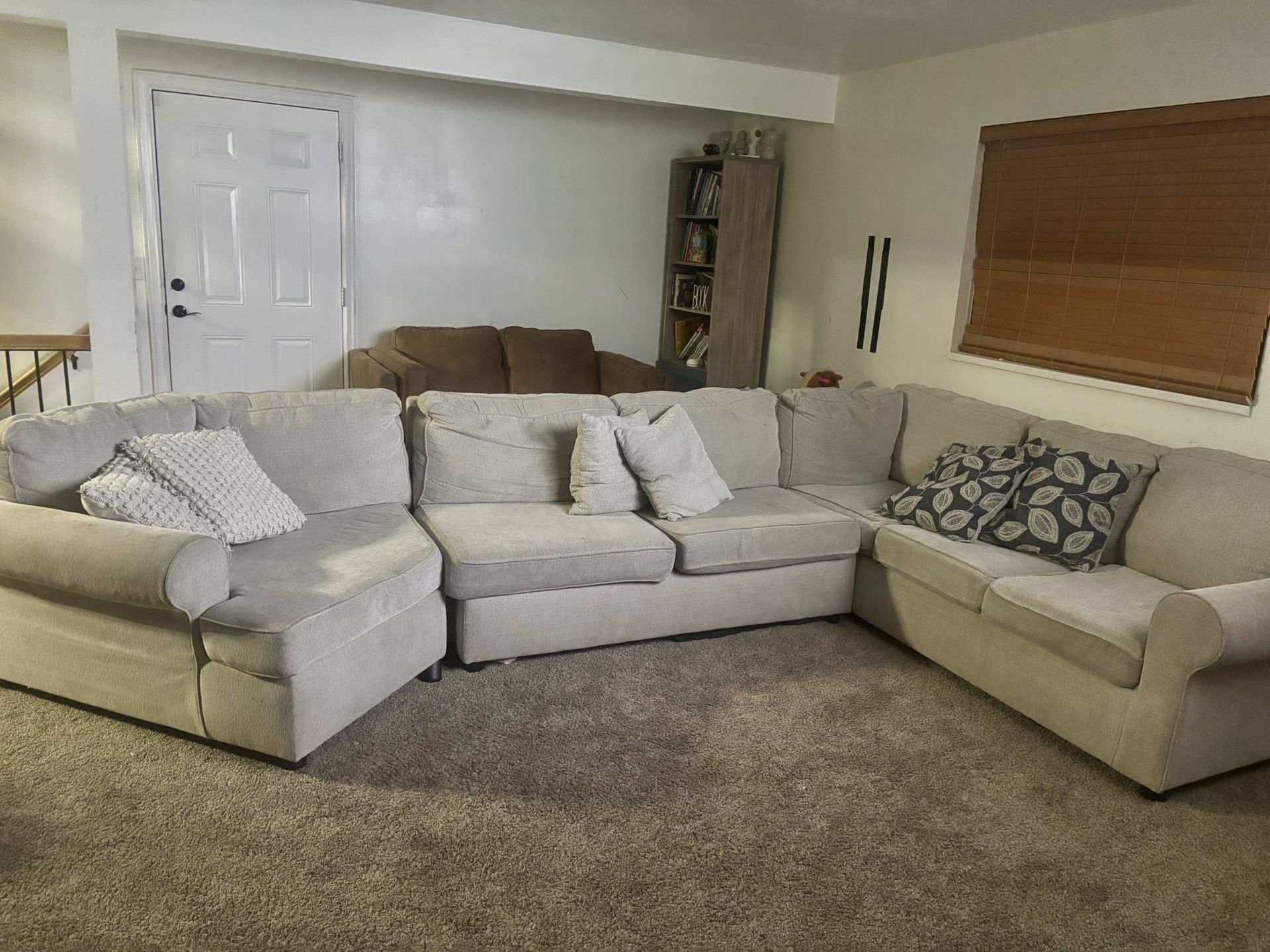 Up for grabs is a large, light gray L-shaped sectional. It is incredibly comfortable and perfect for movie nights or a large family room. It shows some signs of "well-loved" wear and tear (a few rips/scuffs), but it’s still sturdy and has plenty of life left in it. • Color: Light Gray / Pebble • Style: Traditional with rolled arms • Condition: Fair/Good – some minor rips but structurally solid • Price: 250 • Pickup: Must be able to haul (bring a friend!)