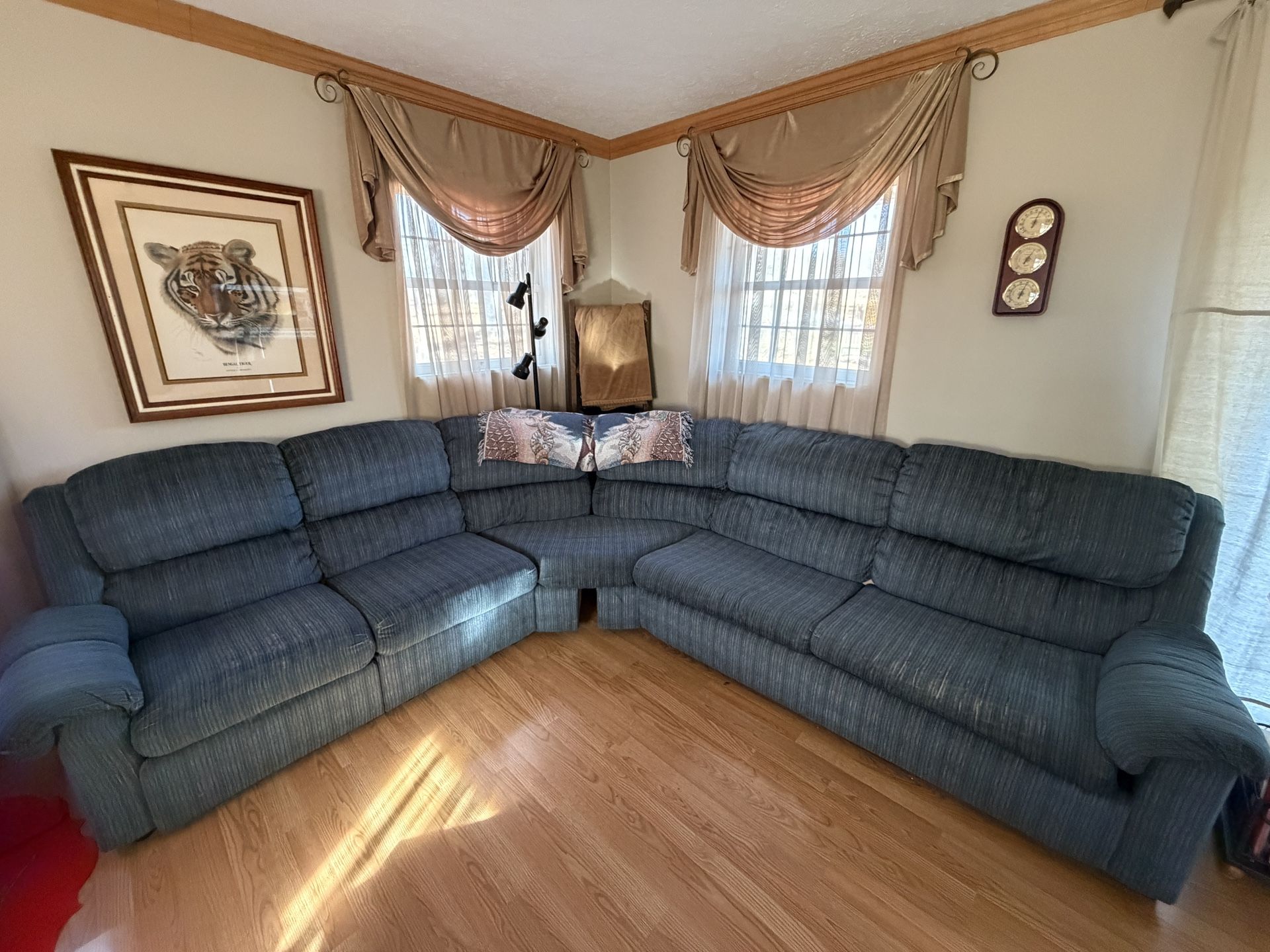 5 seat sectional. Navy/blue color scheme. Slight wear on 2 cushions but still lots of life left and super comfortable!! Pull out sofa bed with mattress, rarely used. Left side seat also reclines. Measurements are : 7.5 feet one way and 8 feet 4 inches the other way including the curve. Upgrading to a different style.