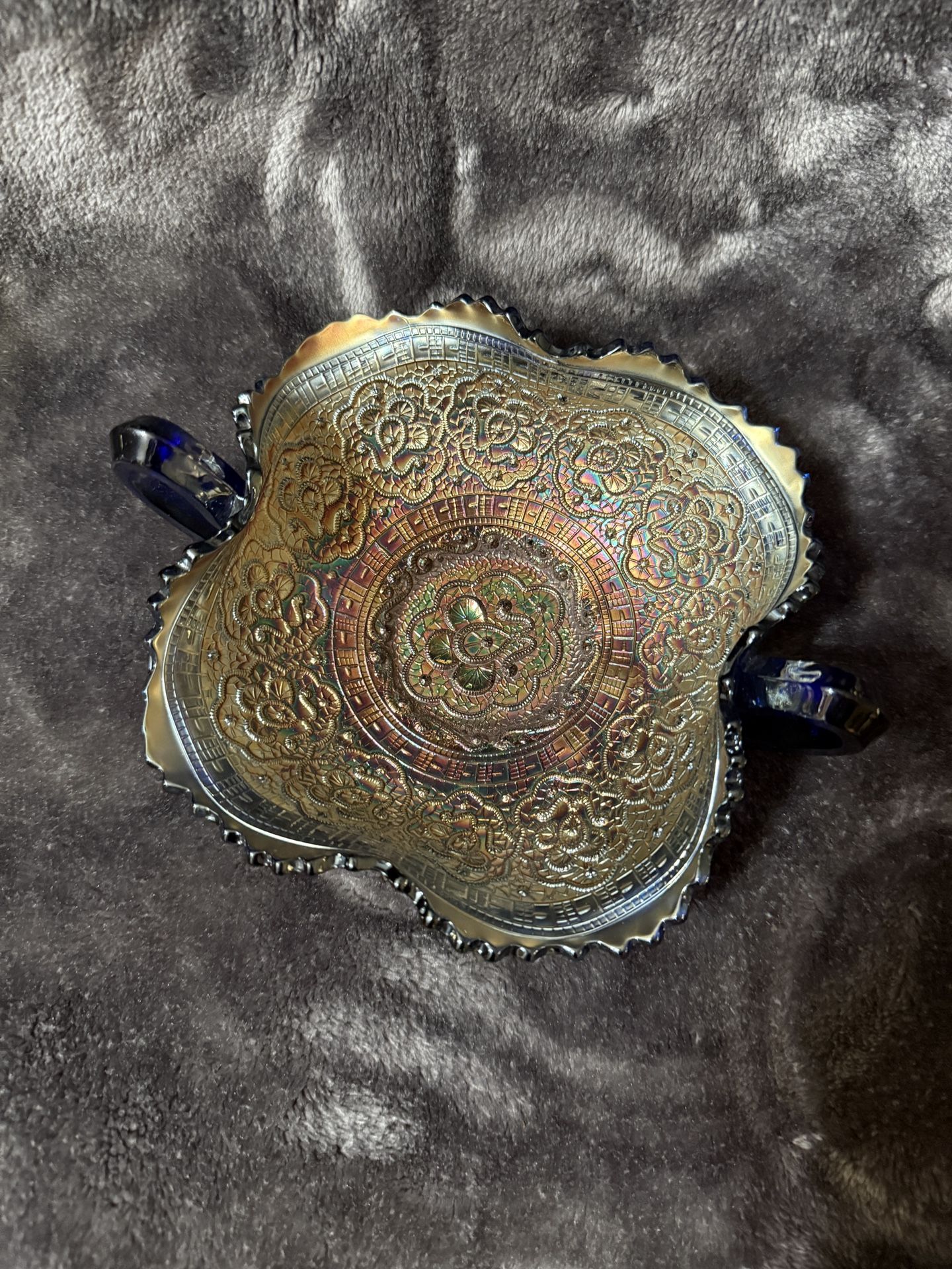 Antique Blue Carnival glass with stand $140 Small Round Carnival Glass Candy Dish $60
