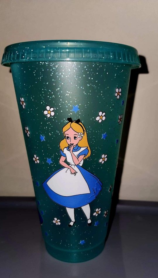 Adorable Alice in wonderland with the Cheshire cat.♡ 24oz. Blue sparkleTumbler w /straw.