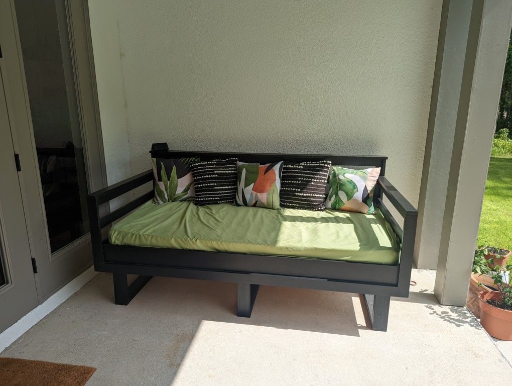 Custom Built Daybed Sofa/Swing. Legs can be removed if you prefer to have swing as hardware is already installed. Made from pine and painted with exterior paint in the color Sherwin Williams Tricorn Black. Will provide paint for touch ups. Price listed is for frame only. Willing to sell mattress and weather resistant cover, sheets and pillows for $850.