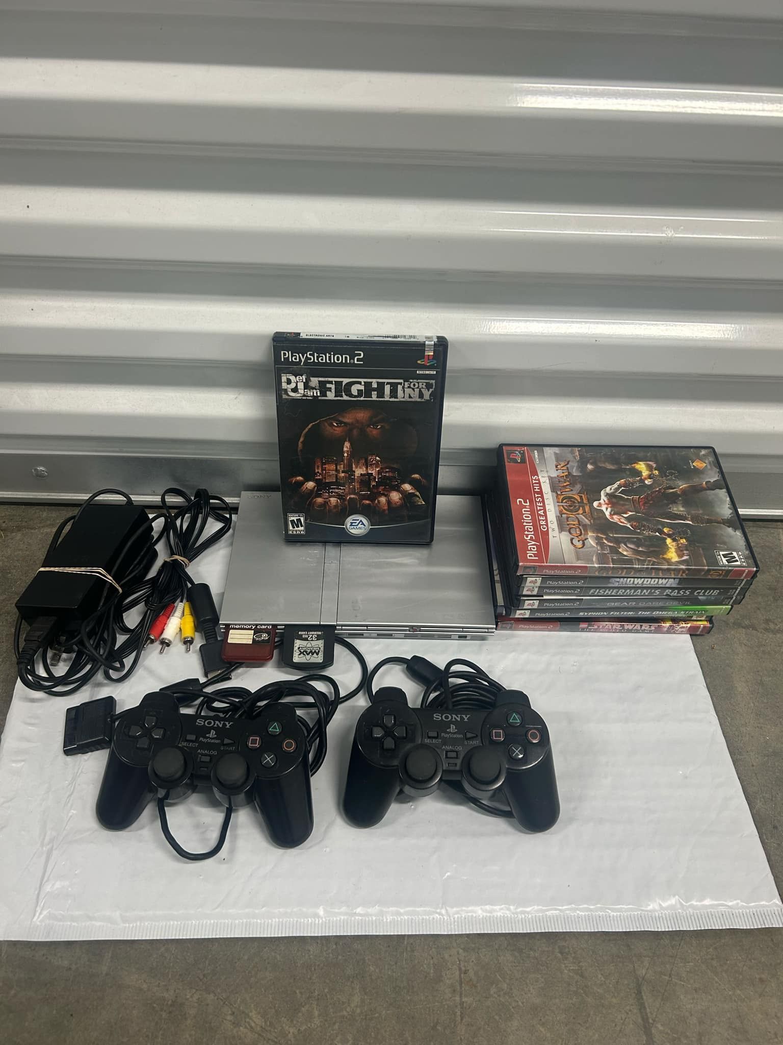 Comes with a silver slim ps2 , 2 controllers, 2 memory cards, and 7 games.