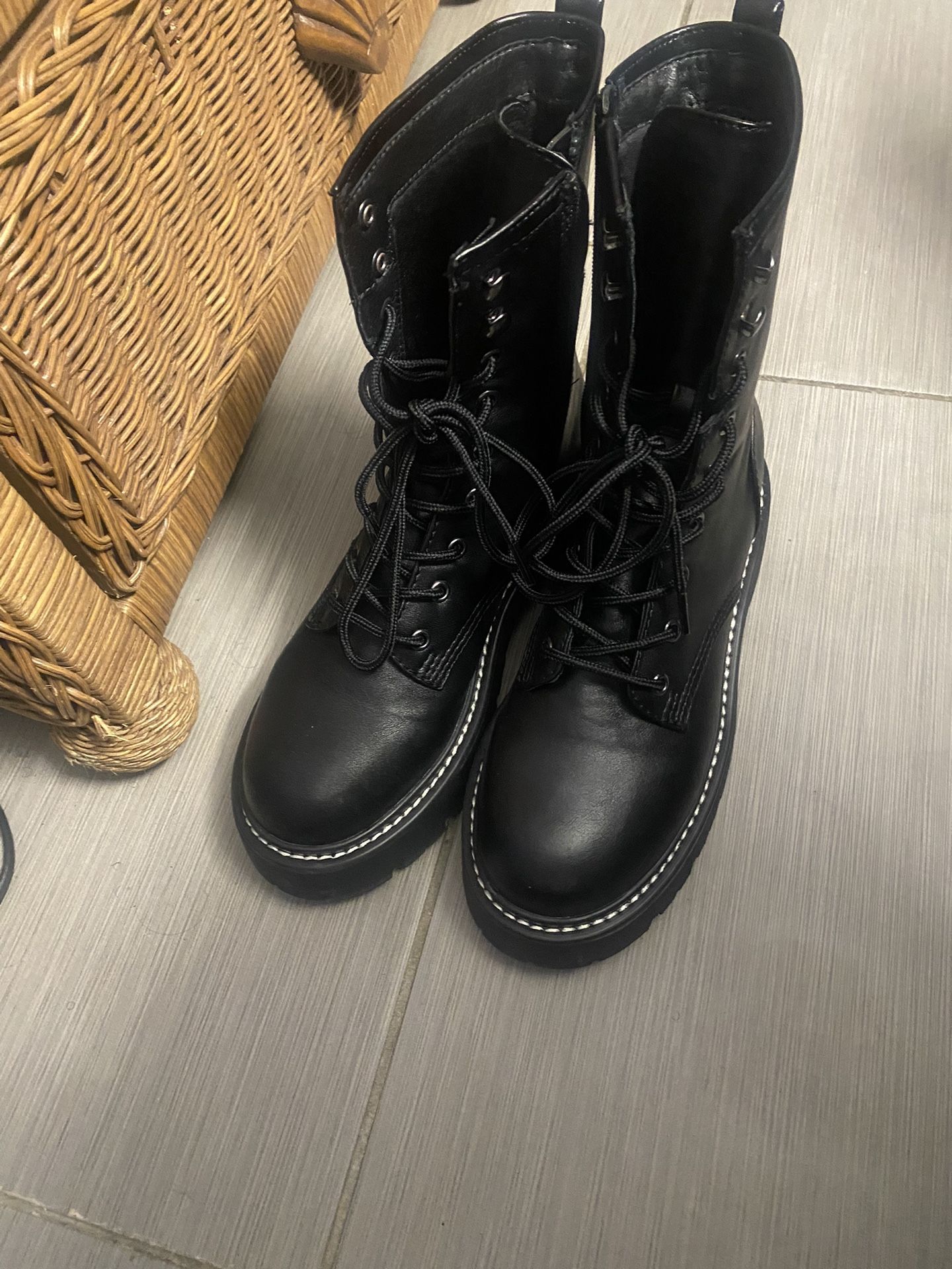 Black Lace-Up Combat Boots - Like New! Selling these stylish black combat boots in excellent condition. Barely worn, with no major scuffs or damage. Features sturdy laces, durable soles, and a comfortable fit. Perfect for any season and versatile for casual or edgy outfits. Size: 9 Women Price: $35 Feel free to message me with any questions or offers!