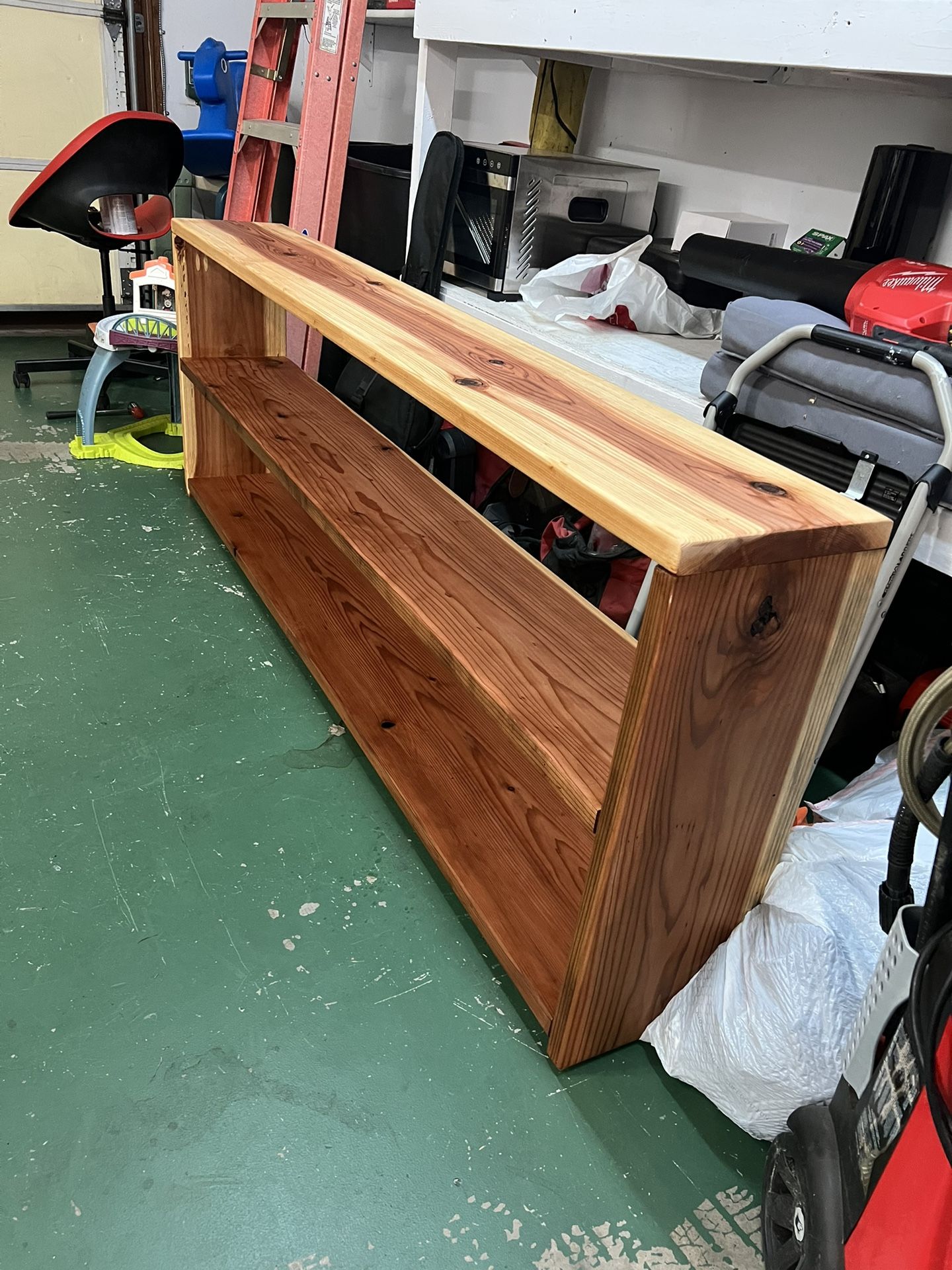 Custom made redwood shelf Every board is cut to size, planed to uniform thickness, routed, sanded, sanded again, sanded again, assembled with pocket hole joinery, doweled, cleaned, protected with clear coat and left to cure, inserts and feet for leveling installed. This particular piece is 6’3” long and 2’5” tall. Only a clear coat poly was applied but I can apply stains if desired.