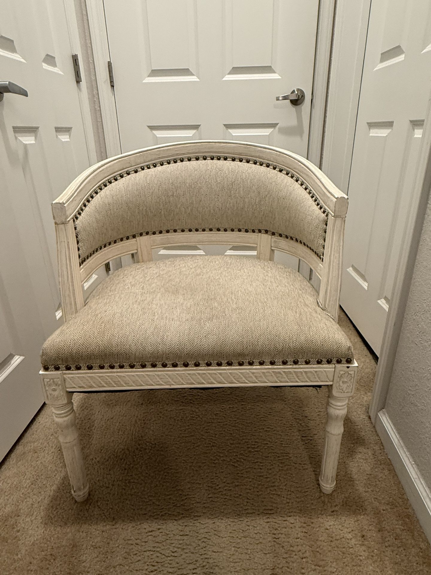 Elegant upholstered accent chair with curved back, nailhead detailing, and distressed wood frame. Neutral fabric. Sturdy and comfortable. Pickup only