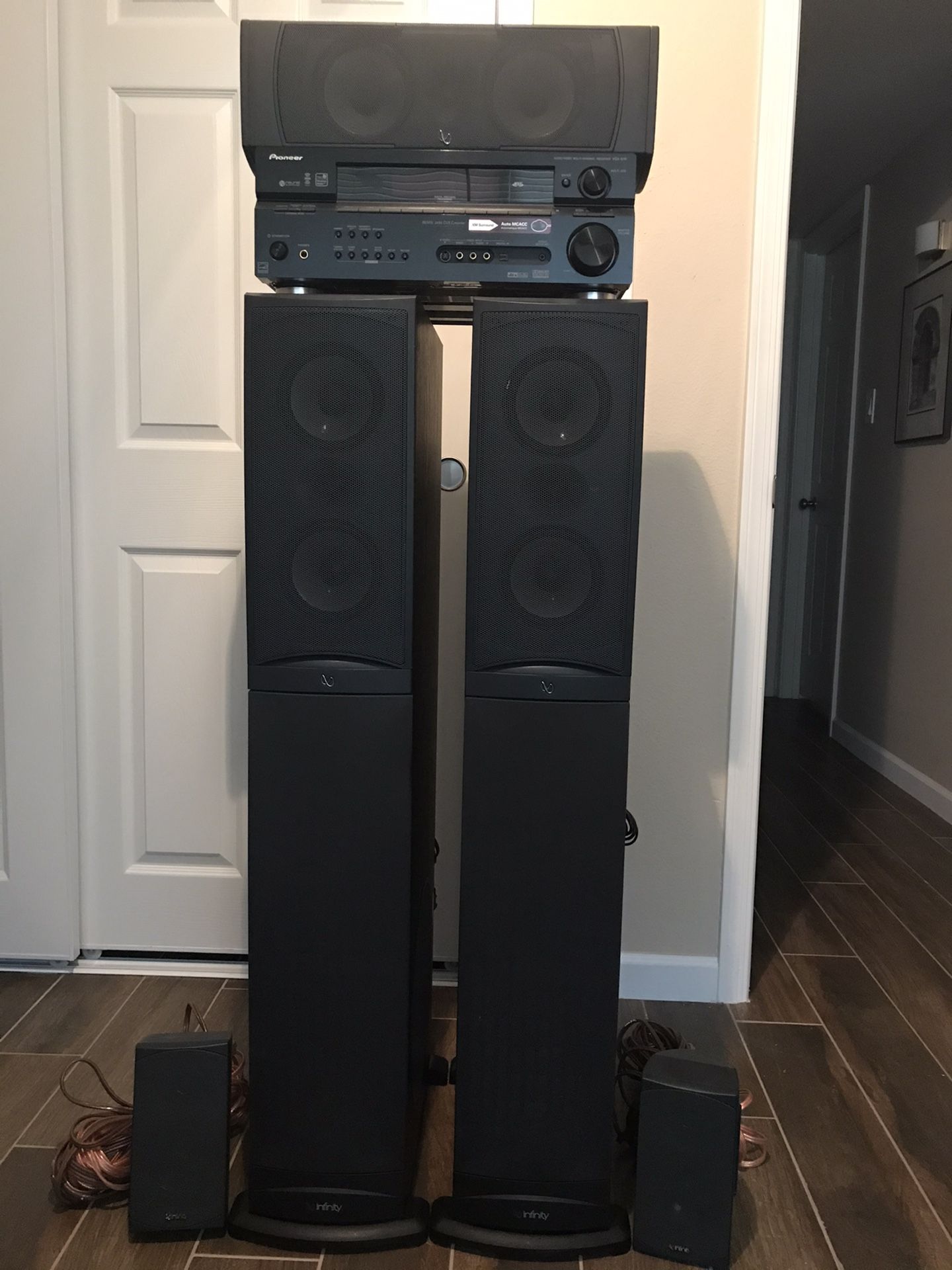 $900 Towers Infinity system with 10”subs Towers 10” subs 8om 200w, AC 120v-60Hz 300w Center Channel 10-150w 8om Pioneer Receiver AC 120v 60Hz 370w 480Va Rear Speakers 10-100w 8om Pick up only