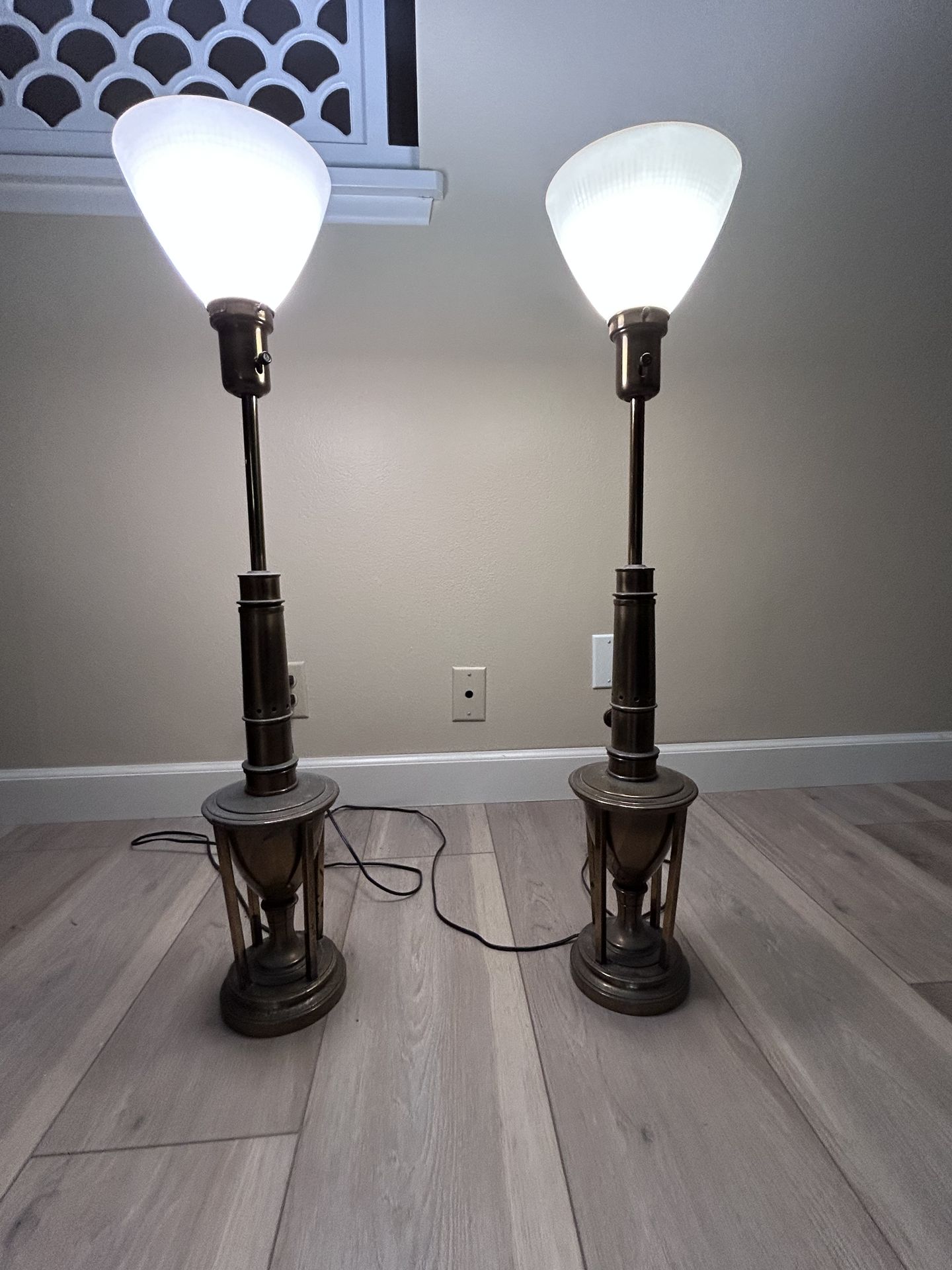 35.5” tall brass lamps that will elevate your mid century modern home. Gorgeous vintage lamps come with original Stiffel lamp shades. $150 for both