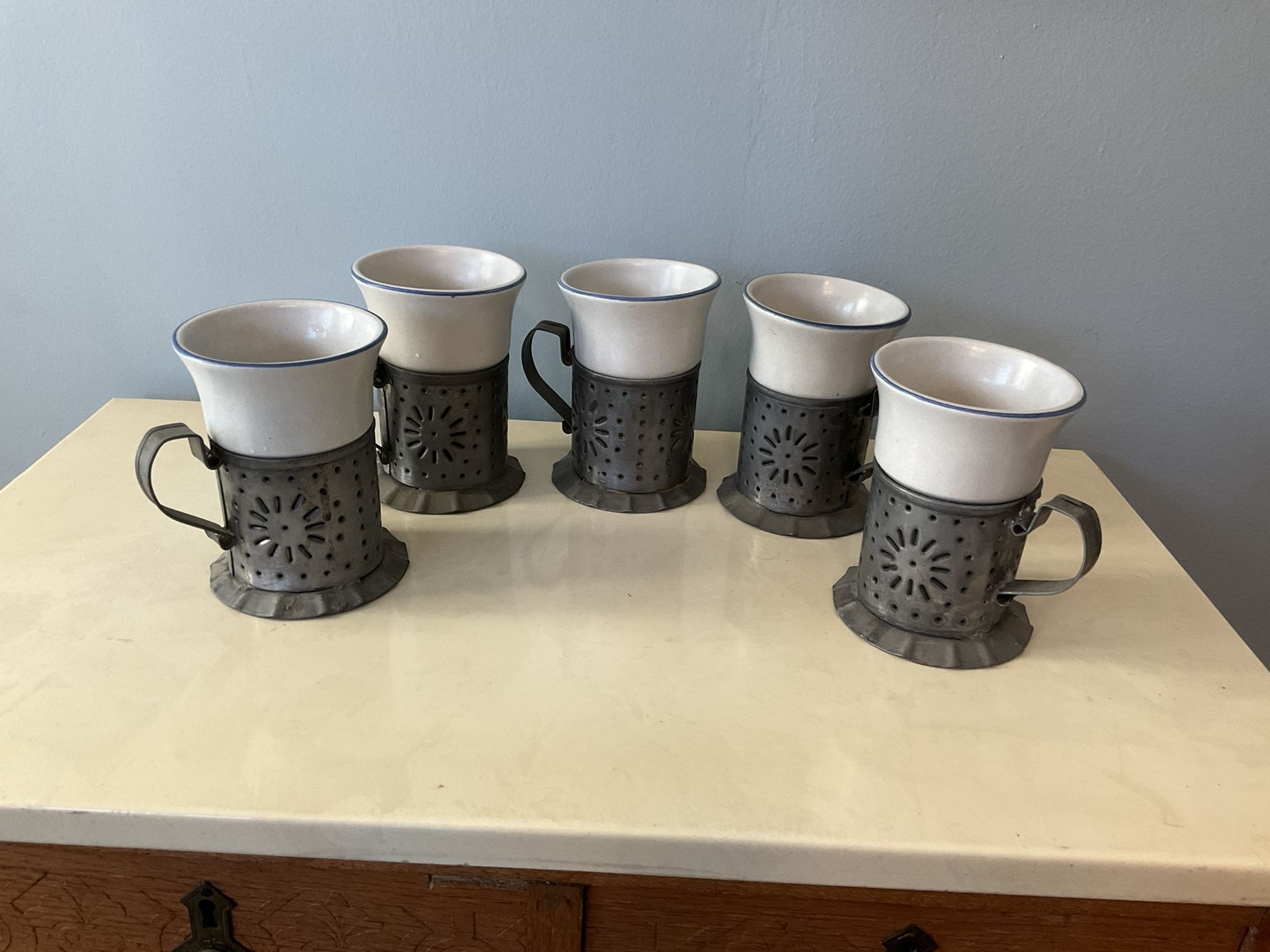 Set of 5 Phaltzgraff Yorktowne Coffee Mugs with Punched Tin Holders for sale. Got these as a wedding gift in the late seventies and we didn’t use them much. Would love to have someone else enjoy them! 5” tall. $25 cash preferred but will accept Venmo.