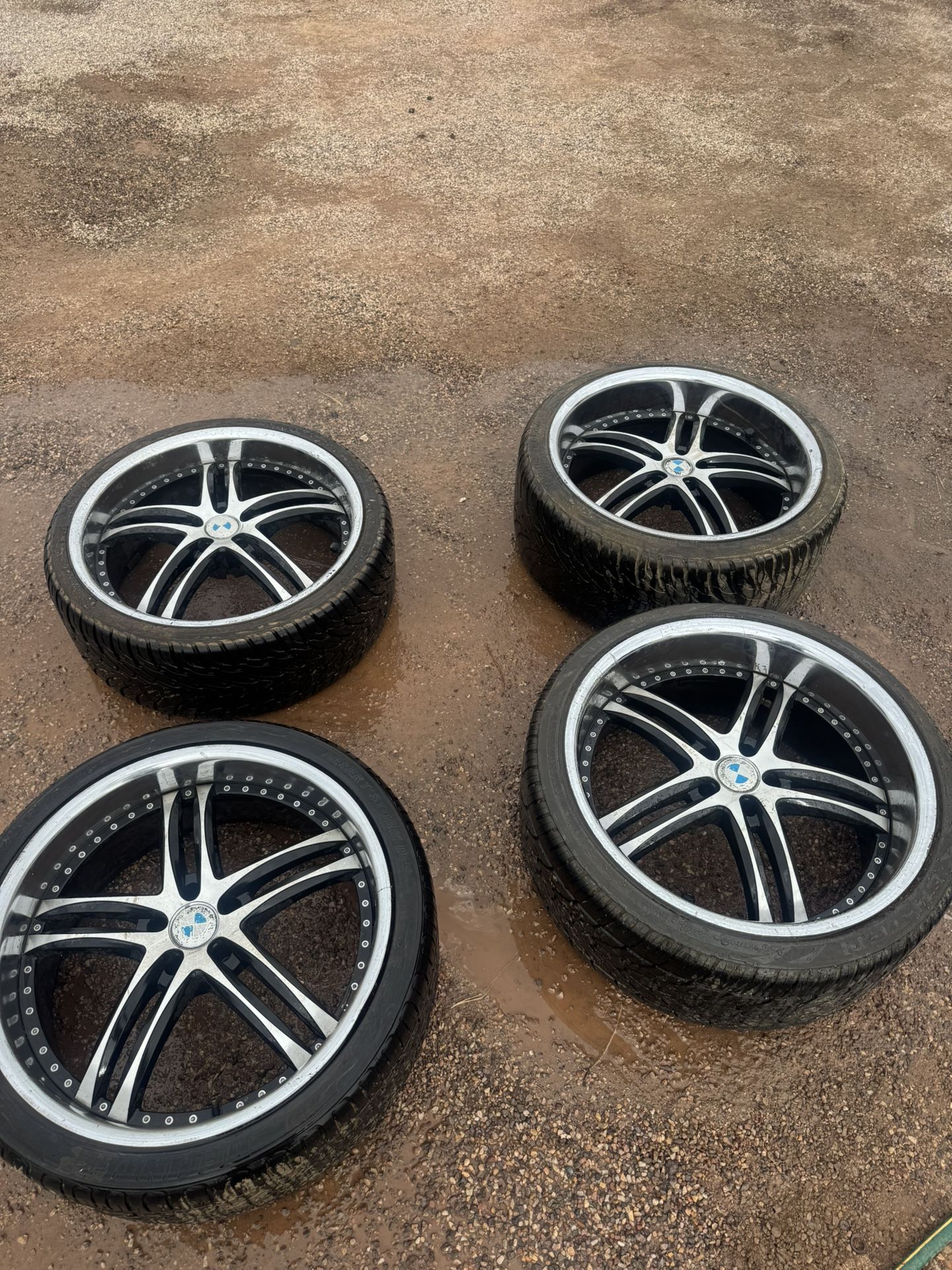 22x9J BMW-fitment wheels (ET15) 22” aftermarket wheels, 5x120 bolt pattern. Deep-lip style with BMW caps. No major bends or cracks. Tires included as-is. Cash only.