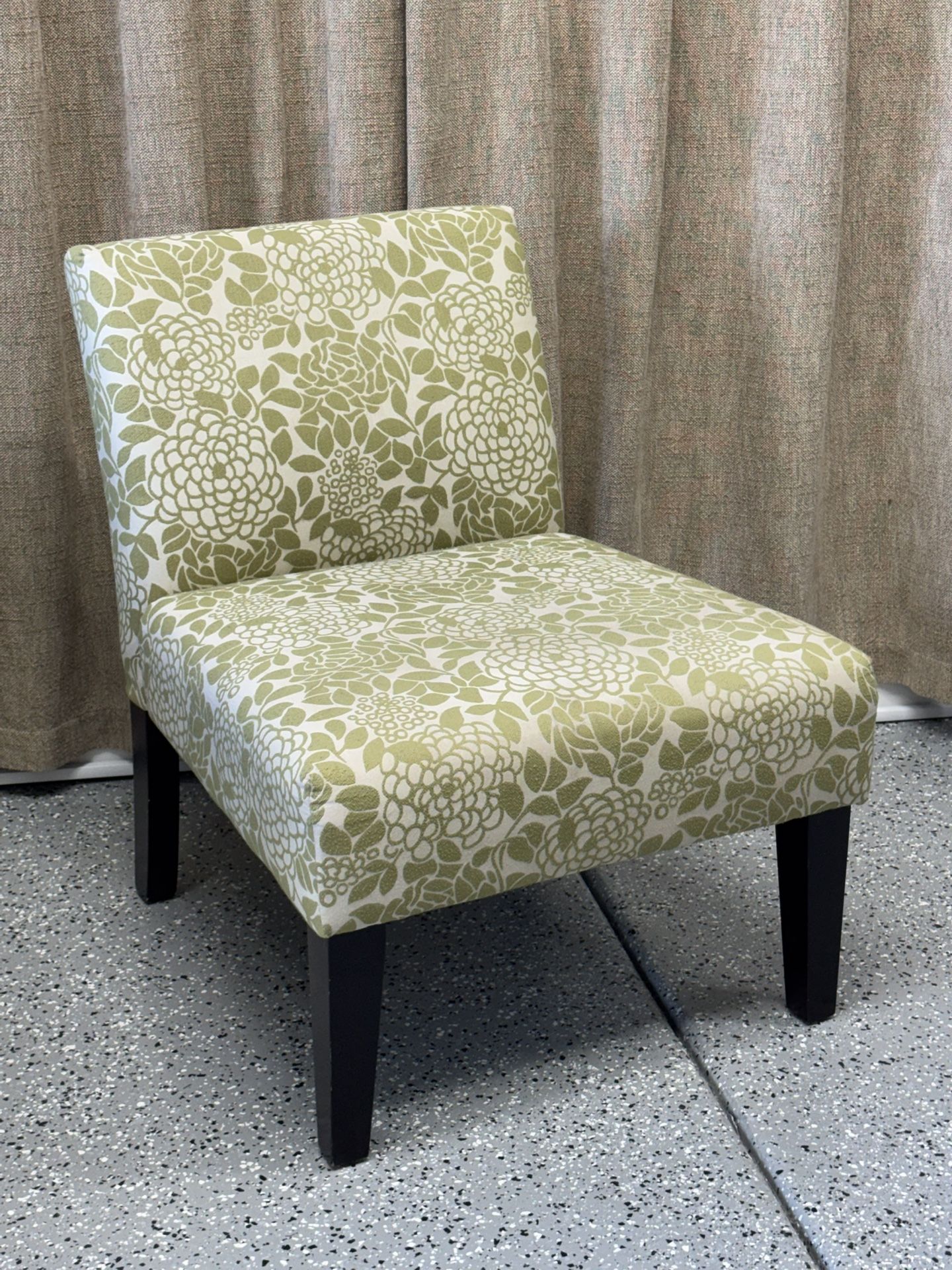Floral armless accent chair. Measurements: Back height 32”, seat height 22.5”, Width 23” to 26”