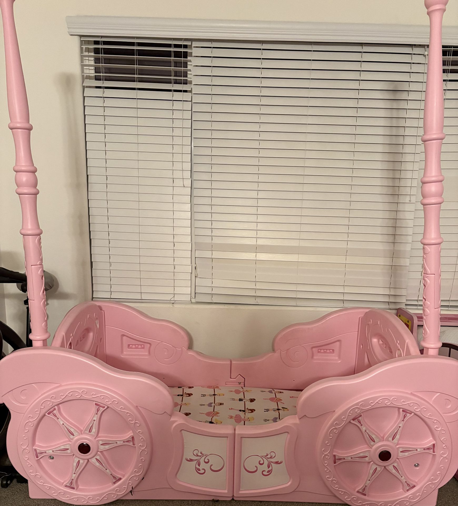 Pink carriage girls toddler bed no mattress . Easy to assemble to toddler or twin bed, come with a bench.