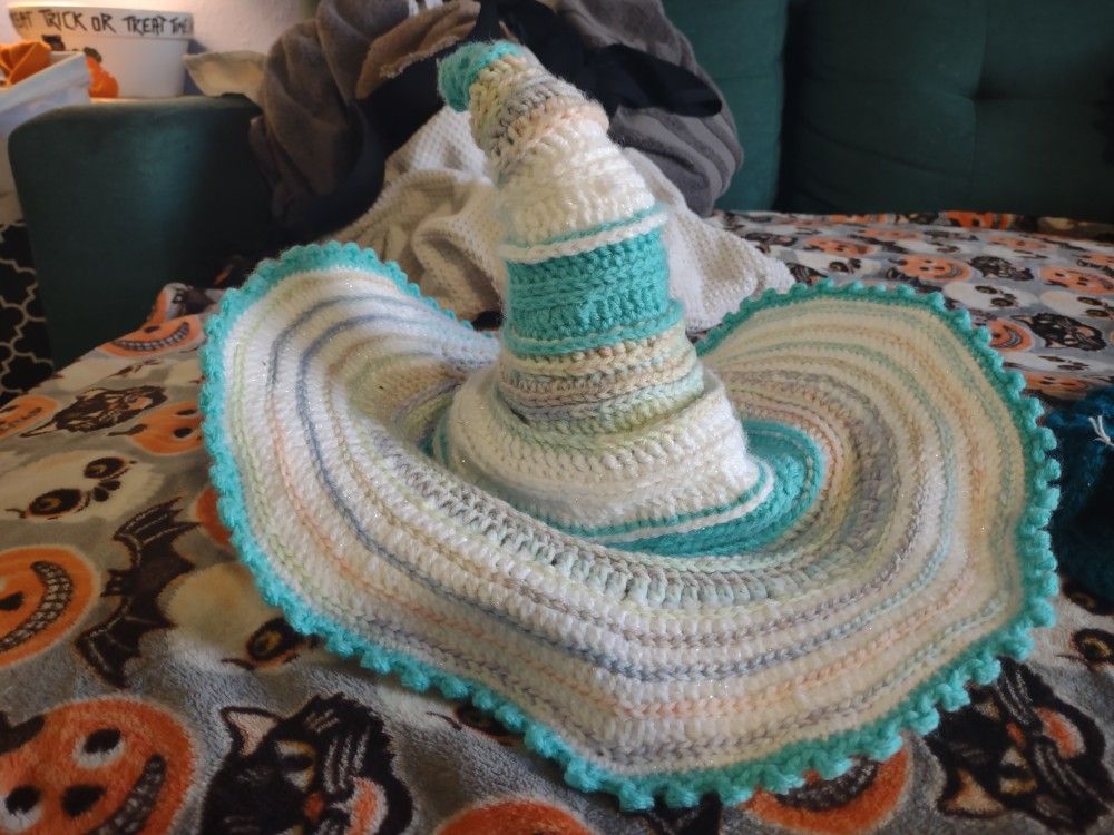 Crochet wizard's hat with wire trim for customization. Handmade by local artist. Sparkly and whimsical! This hat would be a great addition to Halloween costumes, Renaissance festival outfits, or DND games! Also makes for a lovely birthday or Christmas gift.