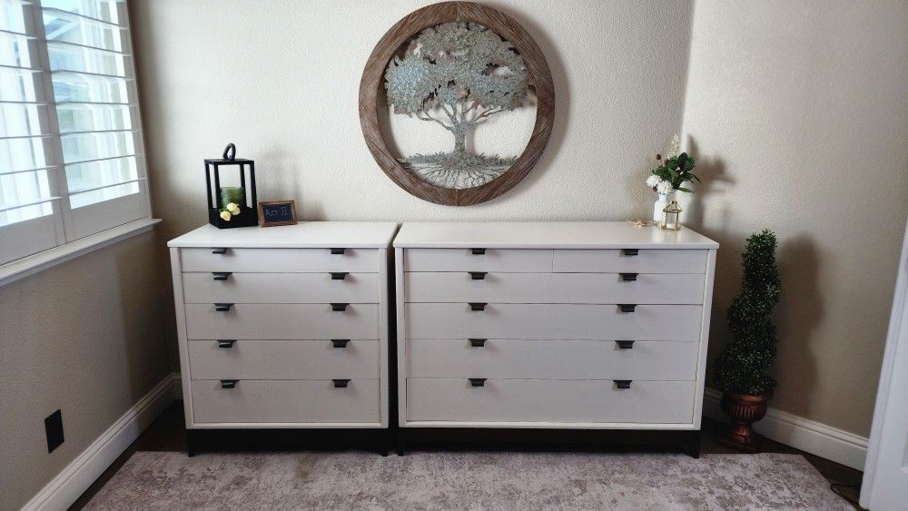 These amazing Drexel Precedent dressers designed by renowned Edward Wormley in the late 1940's have been cleaned up and dreamed up. Painted a creamy "Etiquette" white with custom bulit red oak bases stained a rich Black Walnut for contrast. These are crisp and clean and ready for your space. Solid wood construction, with wide and deep drawers, some even have dividers. All interior and drawers have been waxed to nourish the wood. Gorgeous complimentary paper installed. Original hardware was painted in a hammered burnt amber. These would look great in a bedroom, office, entry, could even be used as oversized nightstands. Priced as a pair, but willing to sell individually. $350 for small $425 for large. All sales final. Door drop Delivery available for a non refundable fee and deposit depending on time and distance. No stairs. Dimensions; Small 35 inches tall 19 inches deep 32 inches wide Large 35 inches tall 19 inches deep 48 inches wide