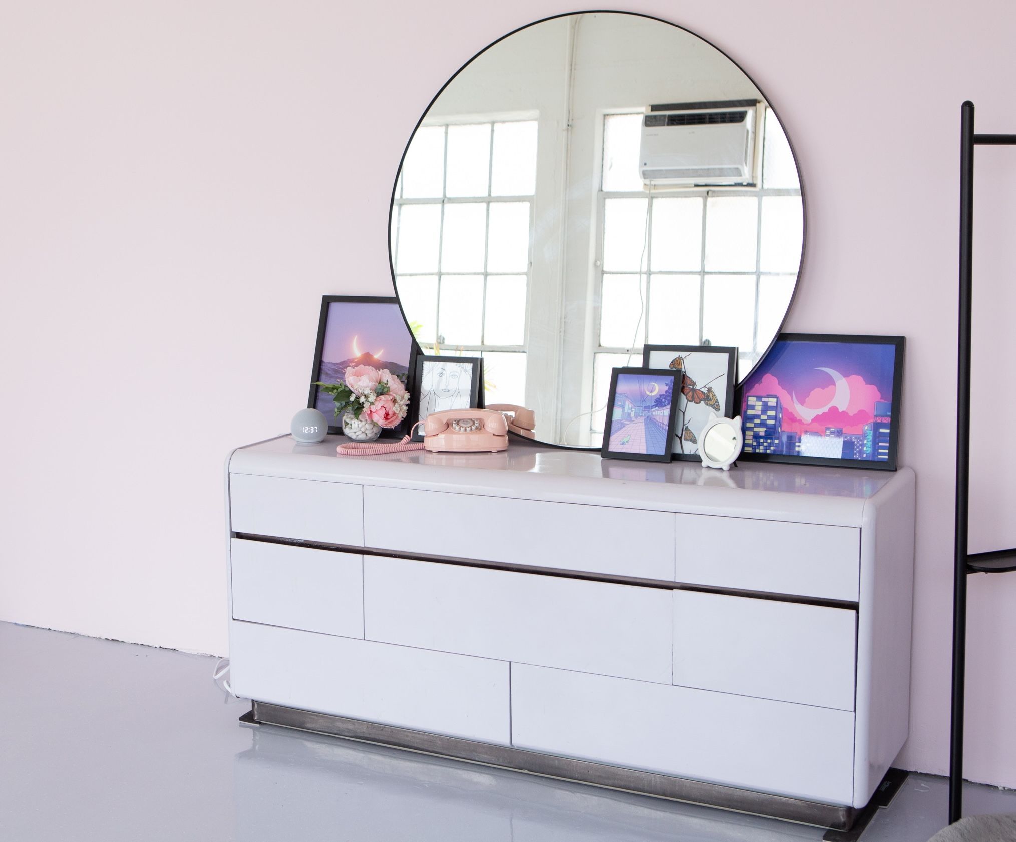 It's an original Lane waterfall dresser, made in solid wood. Its original color was a dusty olive green, I painted it in water based lavender paint and sealed it. Not a professional job, and it's been used/moved since then so the paint is not in good condition. Glossy black base and strip in front is original. Drawers all stick but technically work. 63”L 18”D 29”H