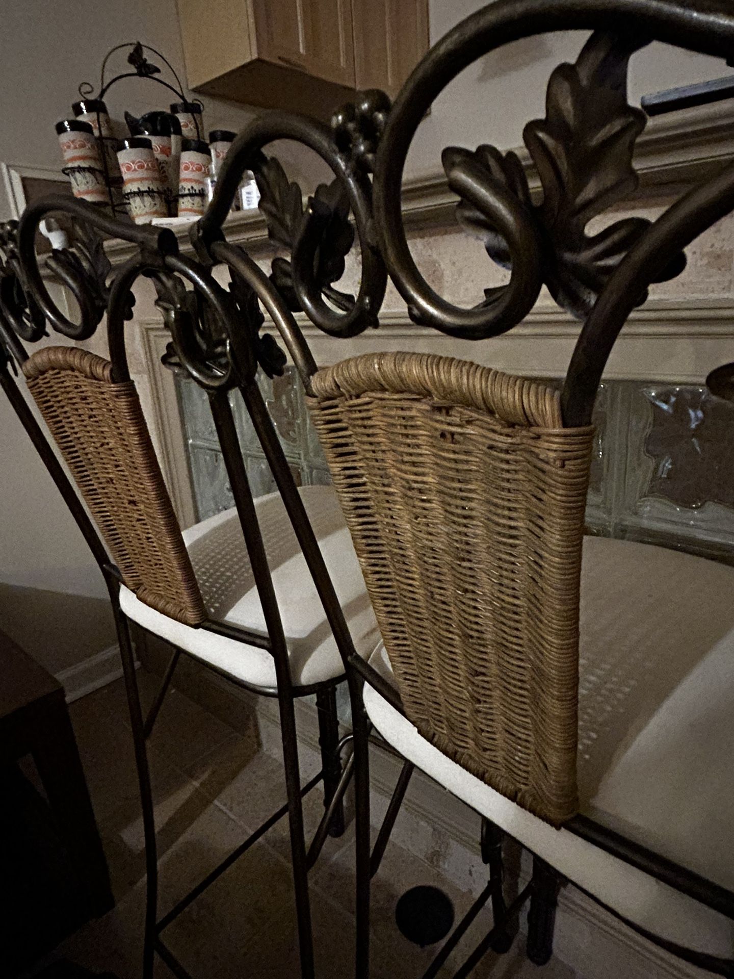 Set of 3 Metal Bar Stools with Wicker Backs and Cushioned Seats – $120