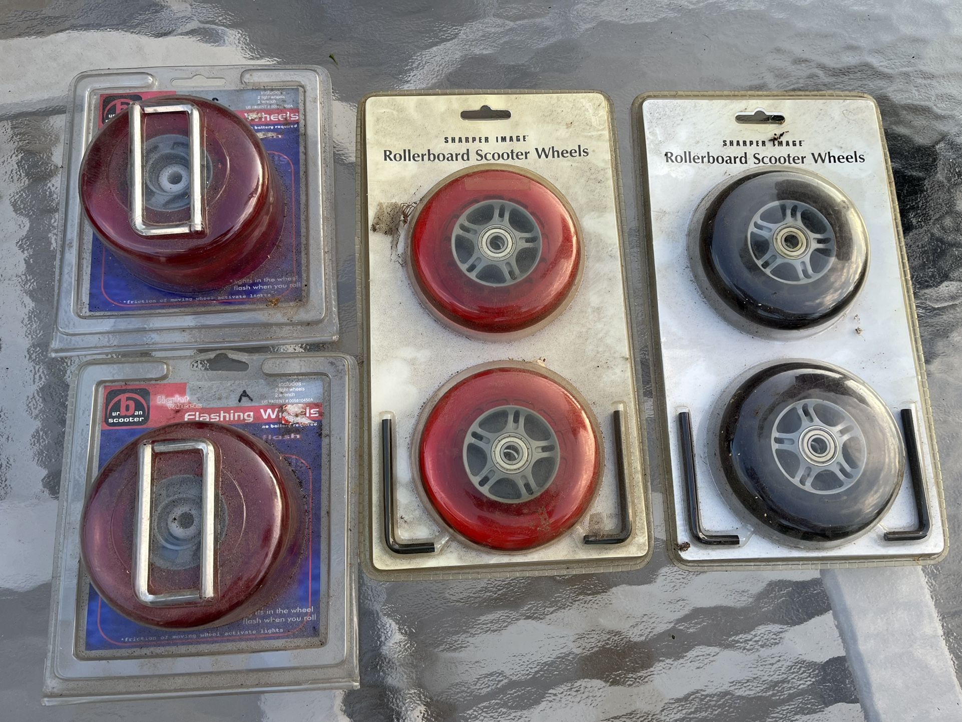 I am selling 4 packs or sets of scooter wheels. All our brand new in packaging. Two of the sets are flashing wheels. Great for scooter wheel replacement or other use. Amazon sells these for $20 per set. I’m asking $25 for all four sets together.