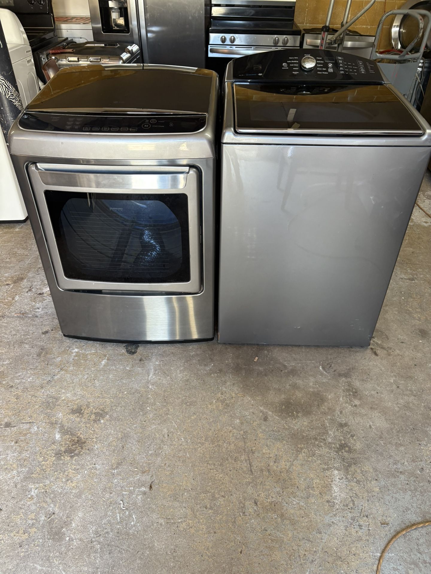 Modern Kenmore washer and dryer set available. Both machines are silver/gray. Washer is a top-load model with a clear lid and digital controls. Dryer has a front-load door and digital controls too. Great for laundry room upgrade. It also has a metallic glare which is super cool ‼️ Delivery and installation available hmu 🖤‼️