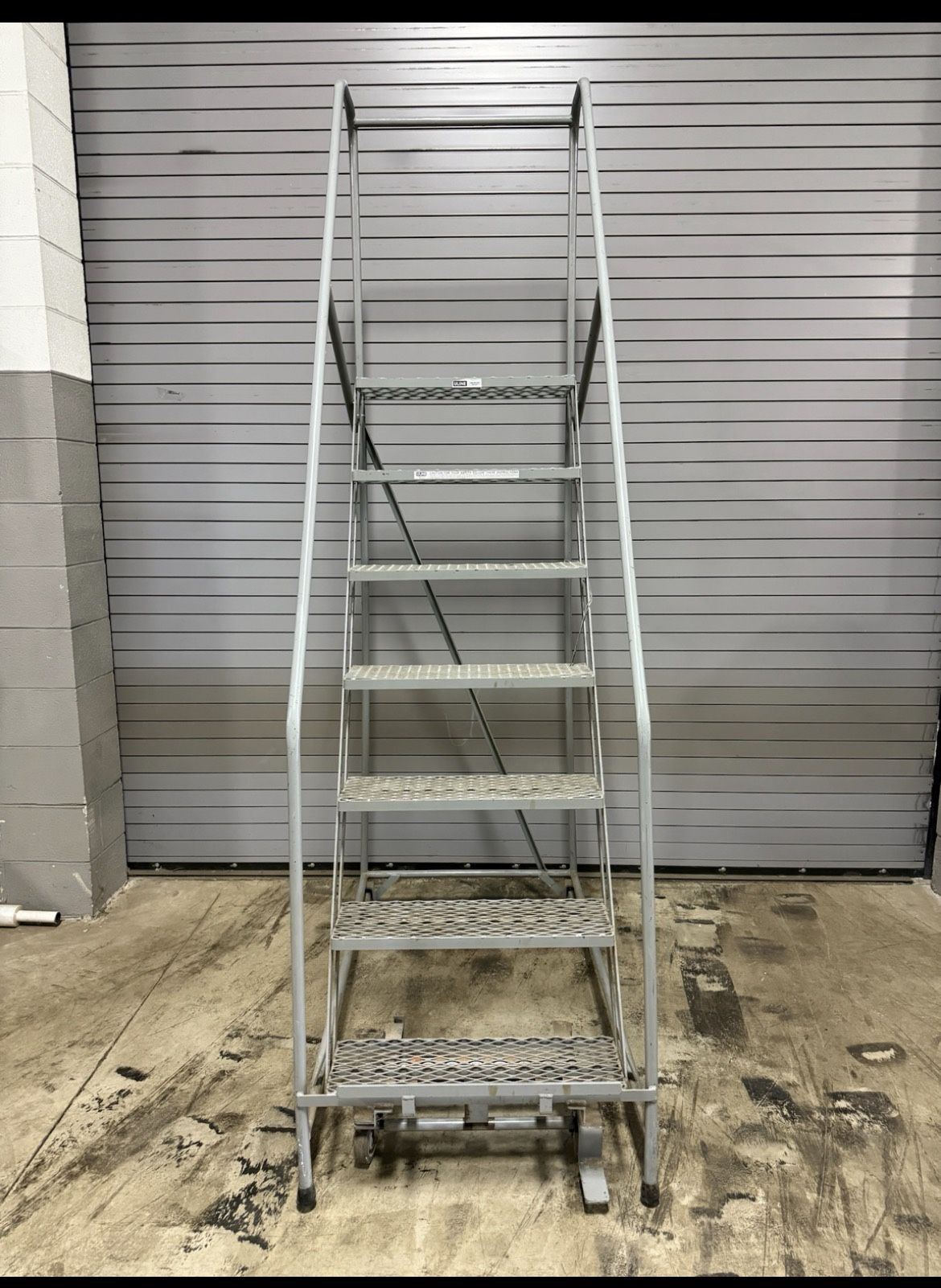 Heavy-duty ULINE rolling warehouse ladder with top safety platform and handrails. • 6-step steel construction • Locking wheels (rolls easily, stable when in use) • Safety handrails and top platform • Commercial/industrial grade • Great for warehouse, shop, church, storage units, or garage Very sturdy and in good condition. Ready for immediate use.