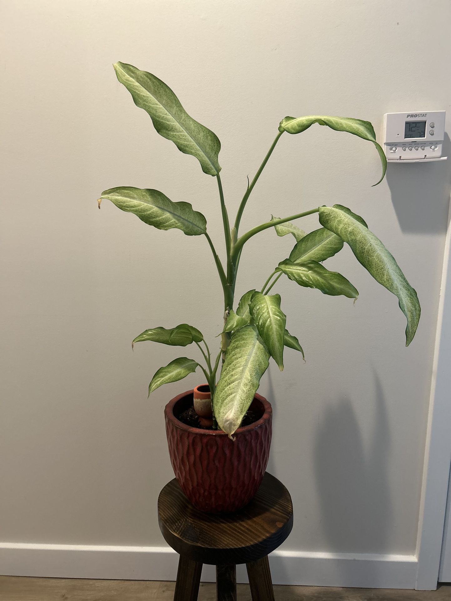 Freckles needs a new home Healthy, mature Dieffenbachia with tall upright growth and large variegated green leaves. Makes a great statement plant for a living room, office, or bright corner. Well cared for, pest-free, and currently in a decorative red ceramic pot (included). • Approx. height: ~2 ft • Low to moderate maintenance • Thrives in bright, indirect light Lots of new growth coming in