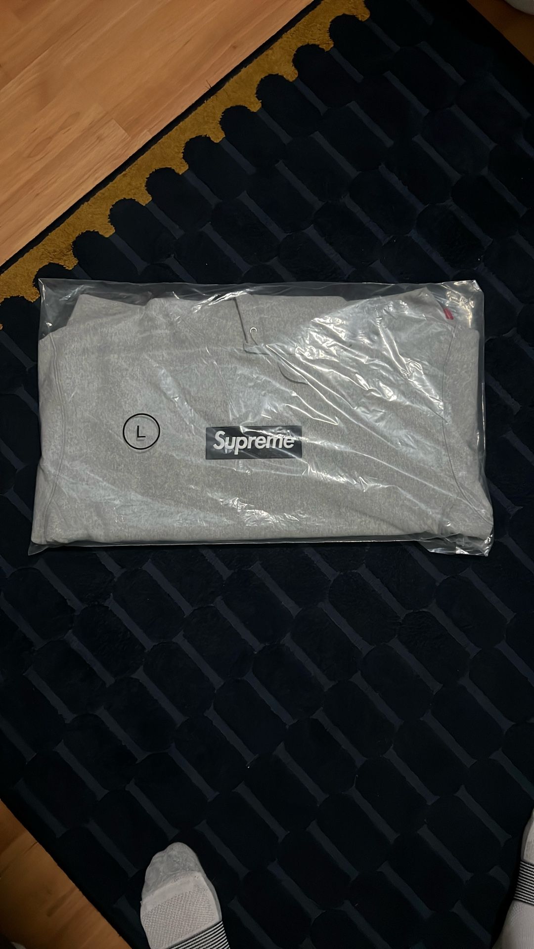 Grey hoodie with a navy box logo
