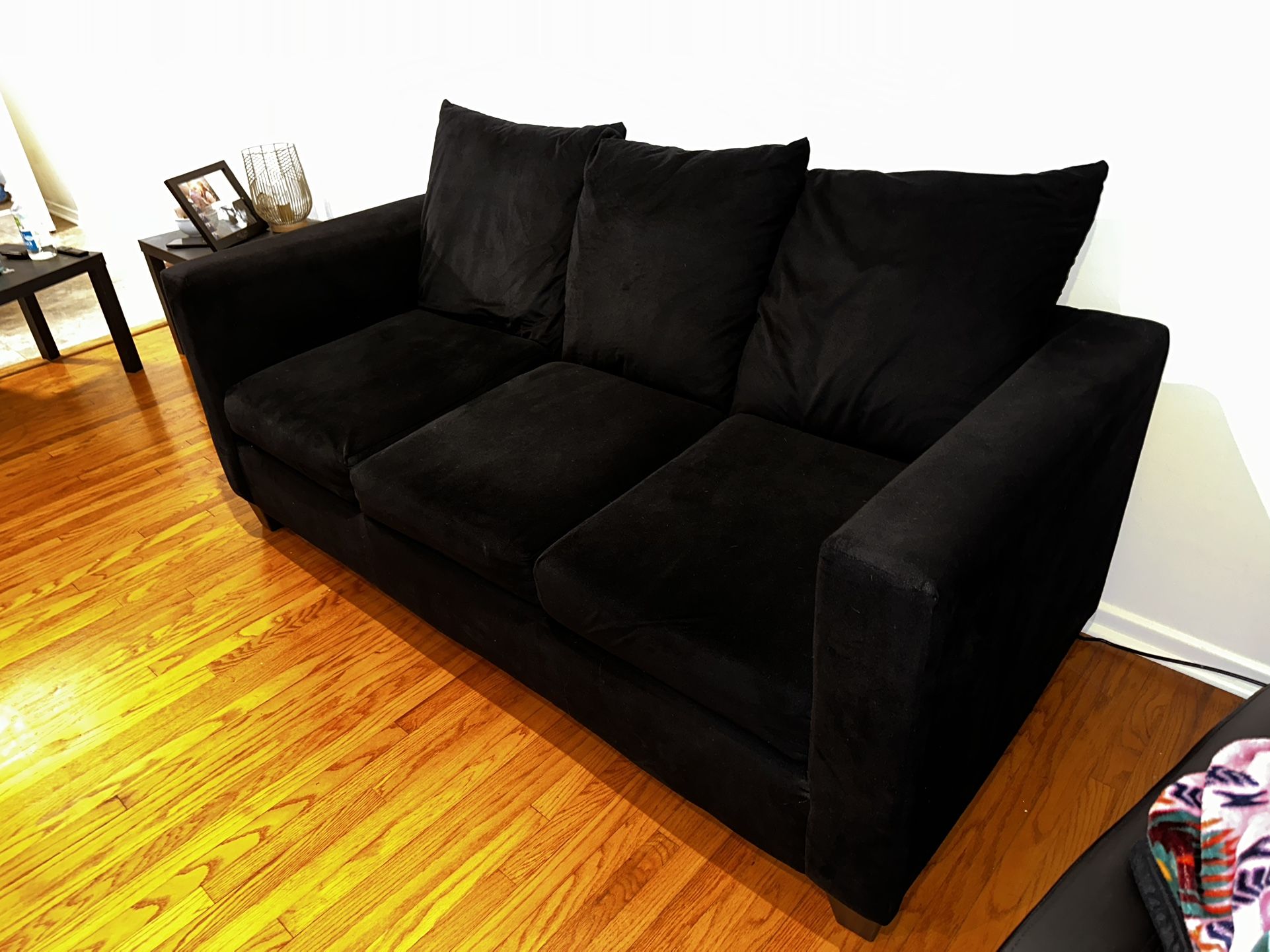 Black microfiber couch. No stains. No tears. No smoking household. Pick up only by Java Station.