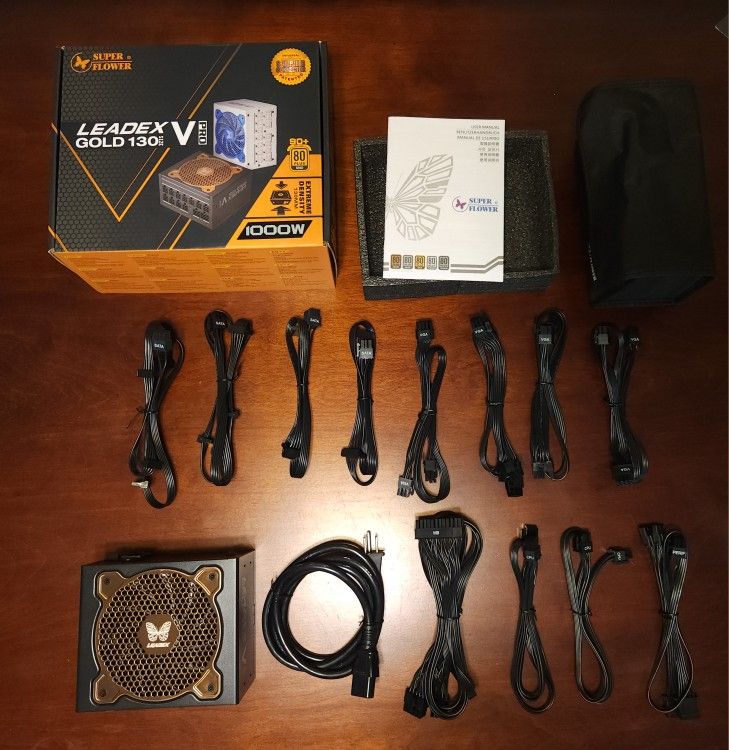 Super Flower Leadex V Gold PRO 1000W ATX 80 PLUS GOLD Certified Power Supply Model Number: SF-1000F14TG (BK) Smallest 130mm 1000W ATX PSU, Patent Super Connectors, Fully Modular, Ultra-Flexible Flat Ribbon Cables This measures at: 130mm (5.118 inches) x 150mm (5.905 inches) x 86mm (3.385 inches) I used this PSU in my SSUPD Meshlicious Mini-ITX with an EVGA RTX 3090 FTW3 Ultra (1/2021 – 1/10/2026). I recently upgraded and demoted both PSU and GPU as an eGPU for my laptop. It was used for productivity and gaming; never used for mining or server systems. I’m selling it because it’s underutilized and I would rather have someone use it for a new build or an upgrade Comes with everything shown in the pics: Retail box w/ manual PSU unit w/ bag for cables 1 Power cable 1 Motherboard cable 2 CPU cables 4 VGA cables (2 x 6+2 pin connectors per cable) 2 SATA cables with 2 connectors 2 SATA cables with 4 connectors 1 Molex cable Just send a message if you have any questions. Price: $130, CASH only deal. No trades. I will pick the public location where we will meet for the exchange.