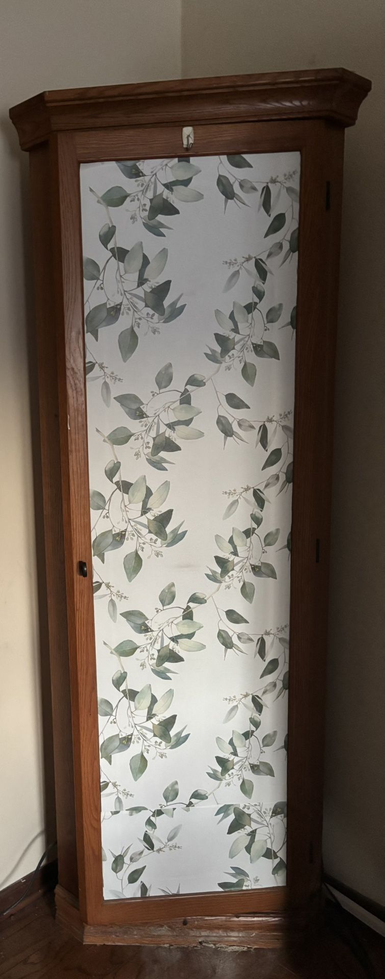 Cabinet with two glass shelves. Built in light. Glass door, but added wallpaper